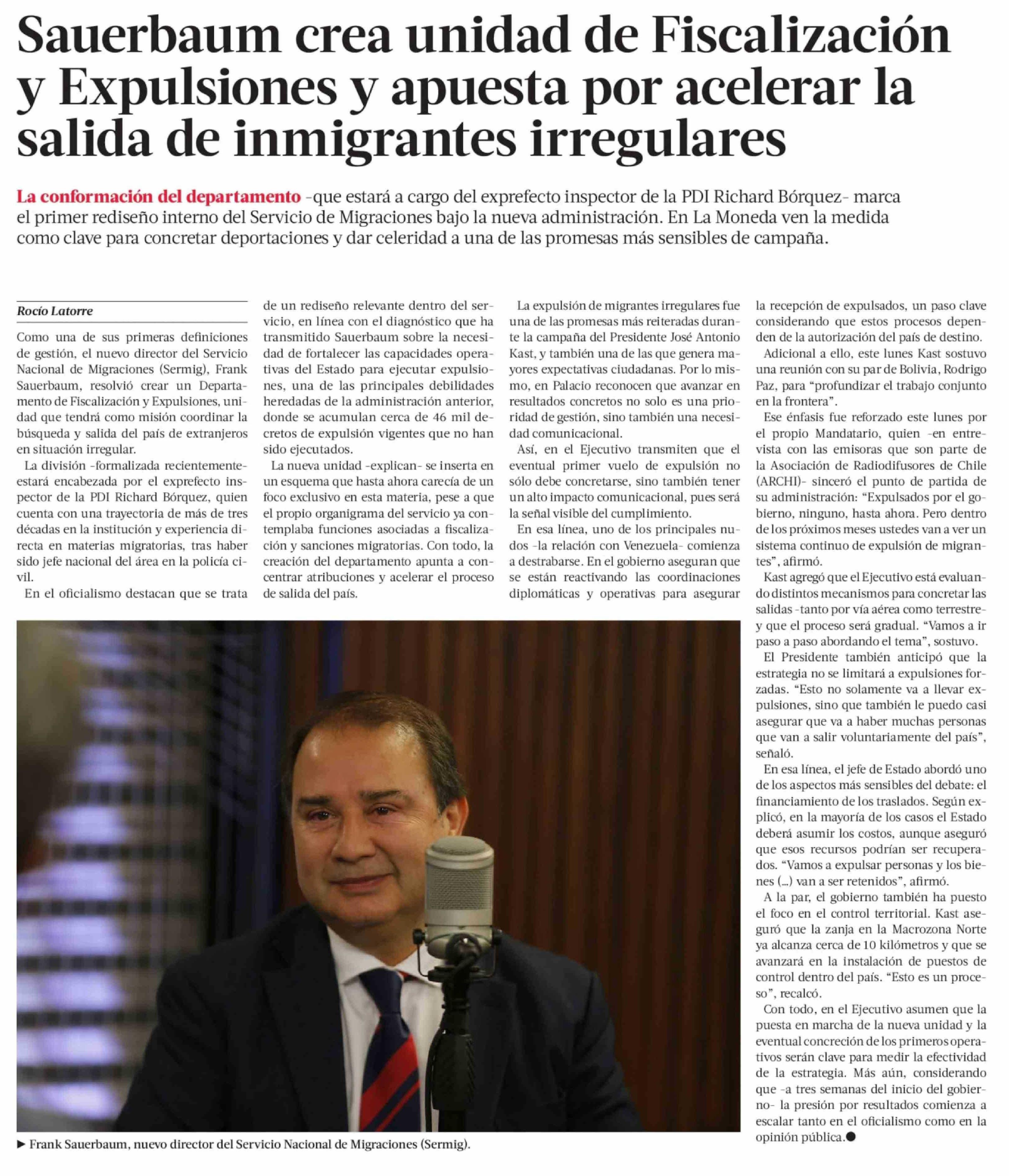 Sauerbaum crea unidad de Fiscalización y Expulsiones y apuesta por acelerar la salida de inmigrantes irregulares