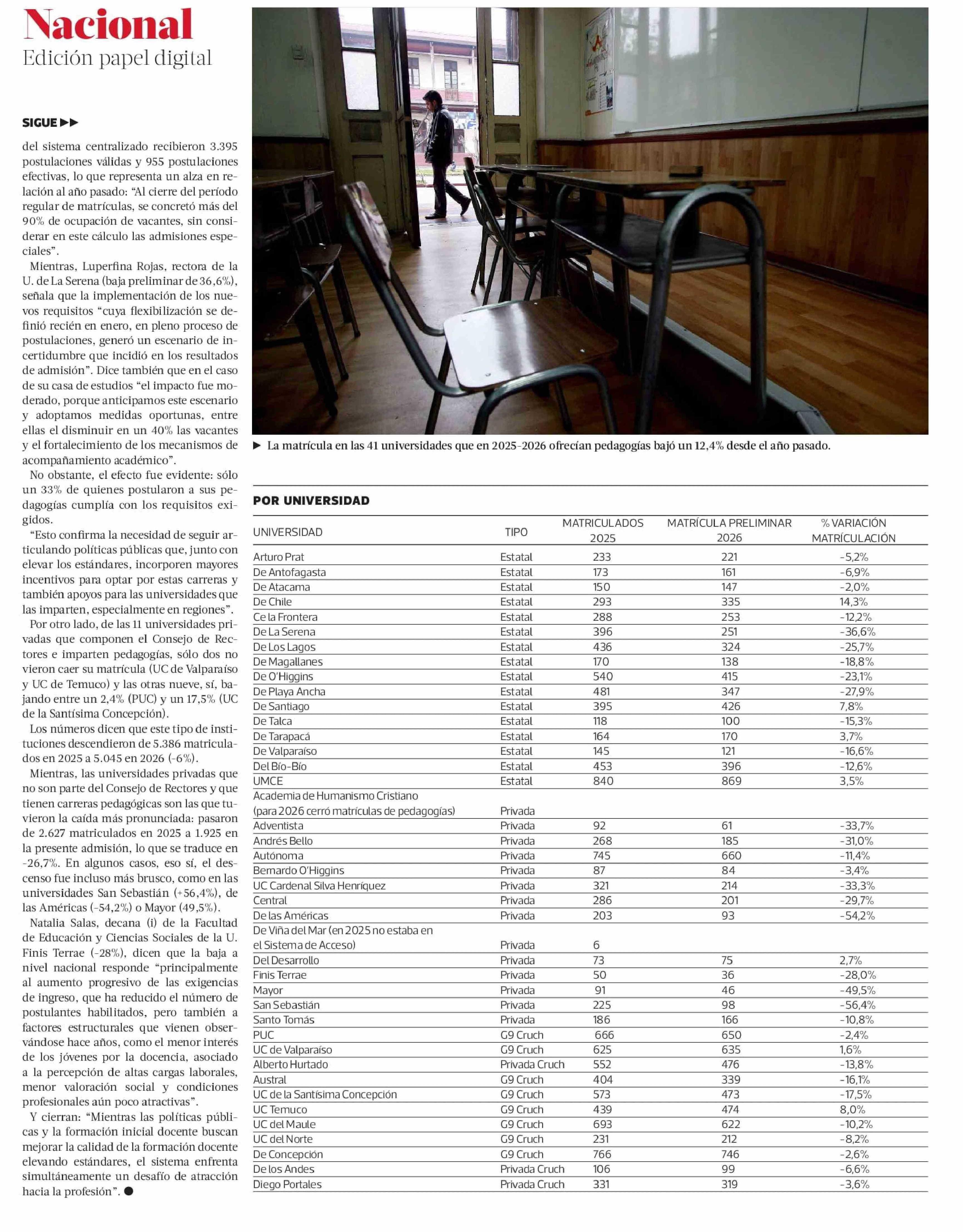 El efecto del alza en los requisitos de postulación: matrícula preliminar de pedagogías baja un 12,4%