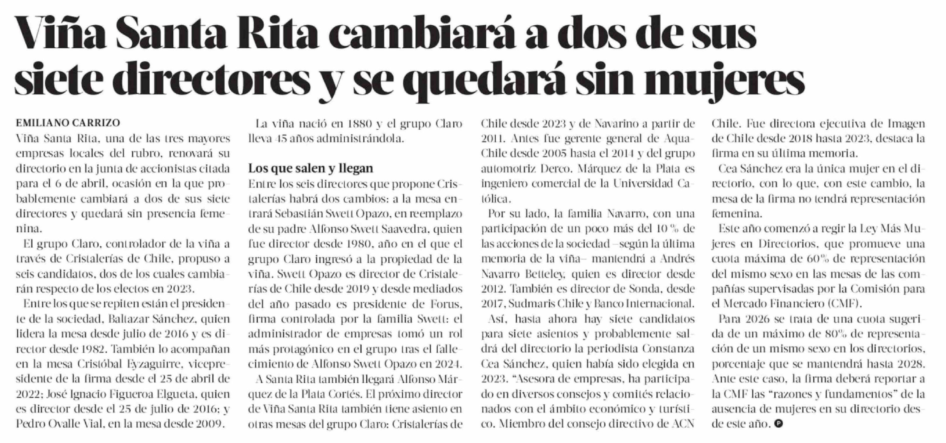 Viña Santa Rita cambiará a dos de sus siete directores y se quedará sin mujeres