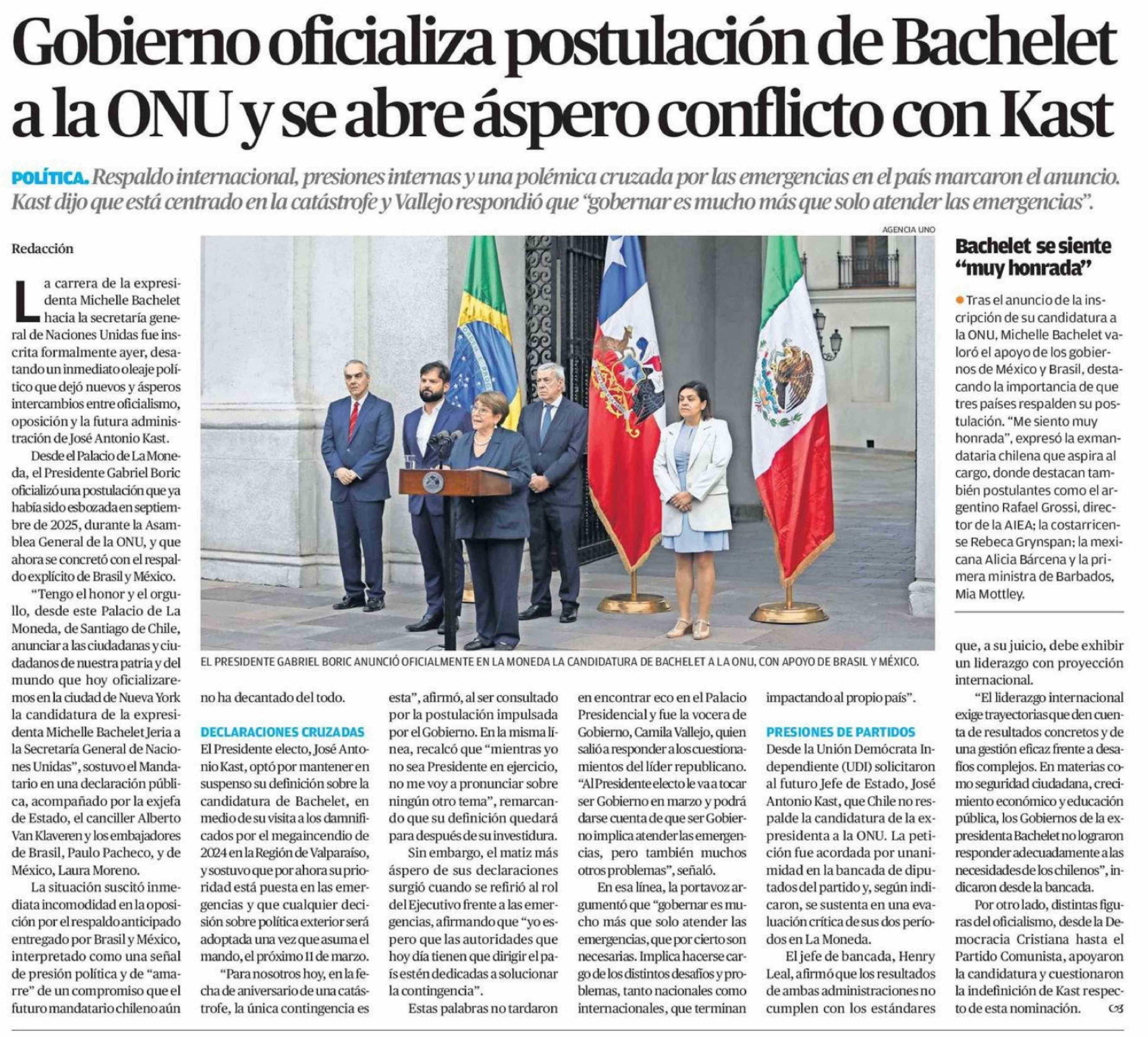 Gobierno oficializa postulación de Bachelet a la ONU y se abre áspero conflicto con Kast