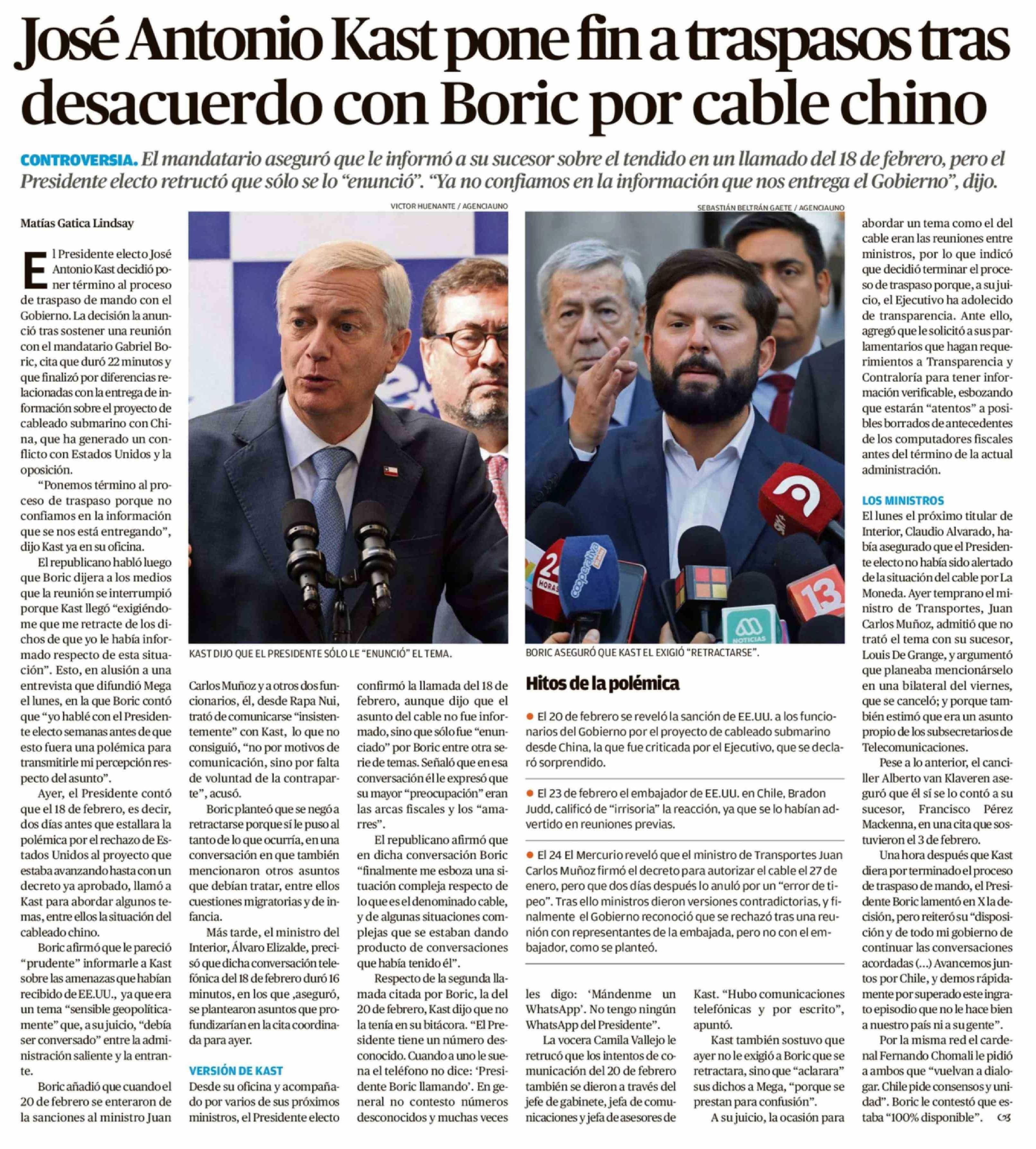 José Antonio Kast pone fin a traspasos tras desacuerdo con Boric por cable chino