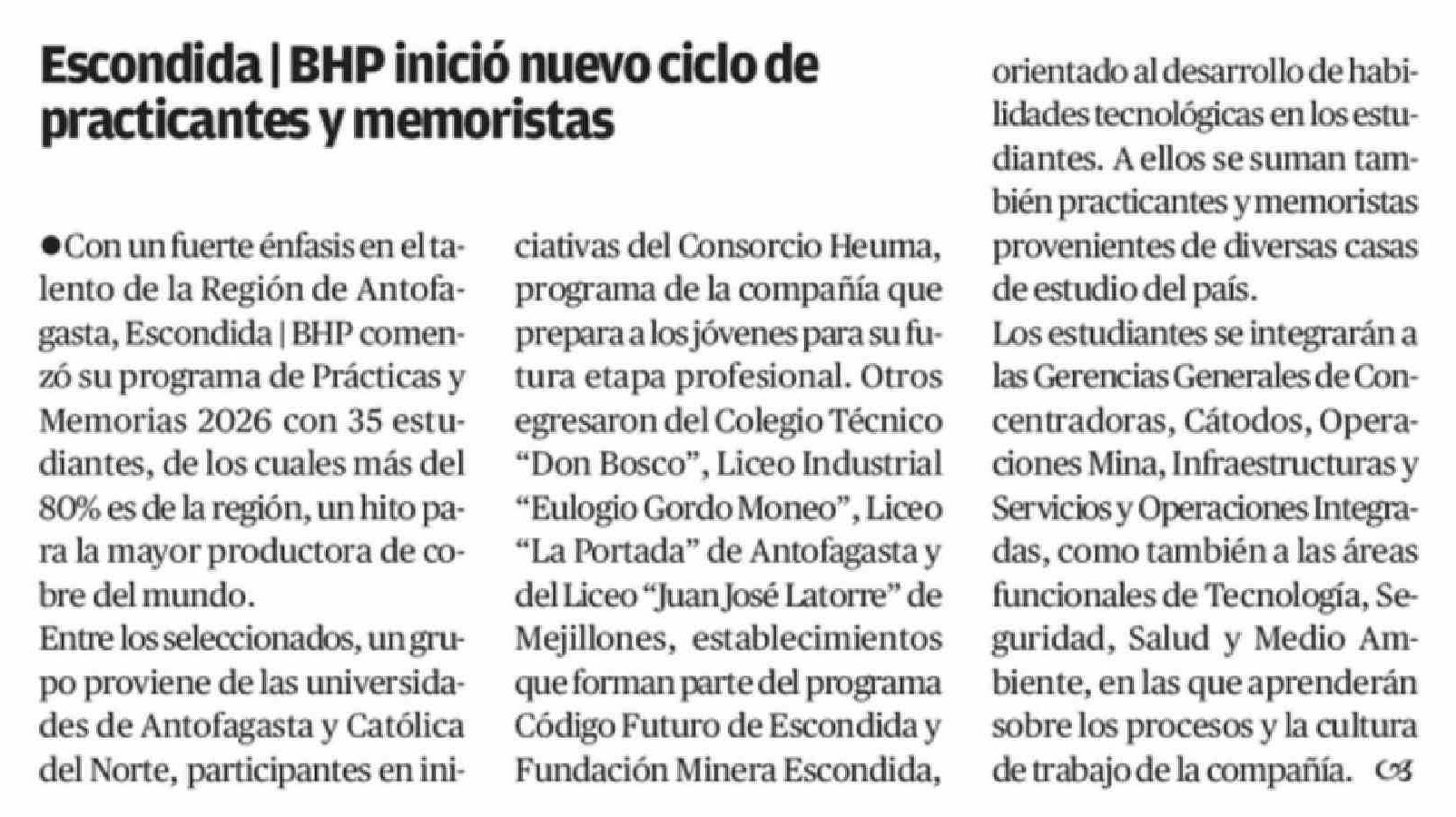 Escondida | BHP inició nuevo ciclo de practicantes y memoristas
