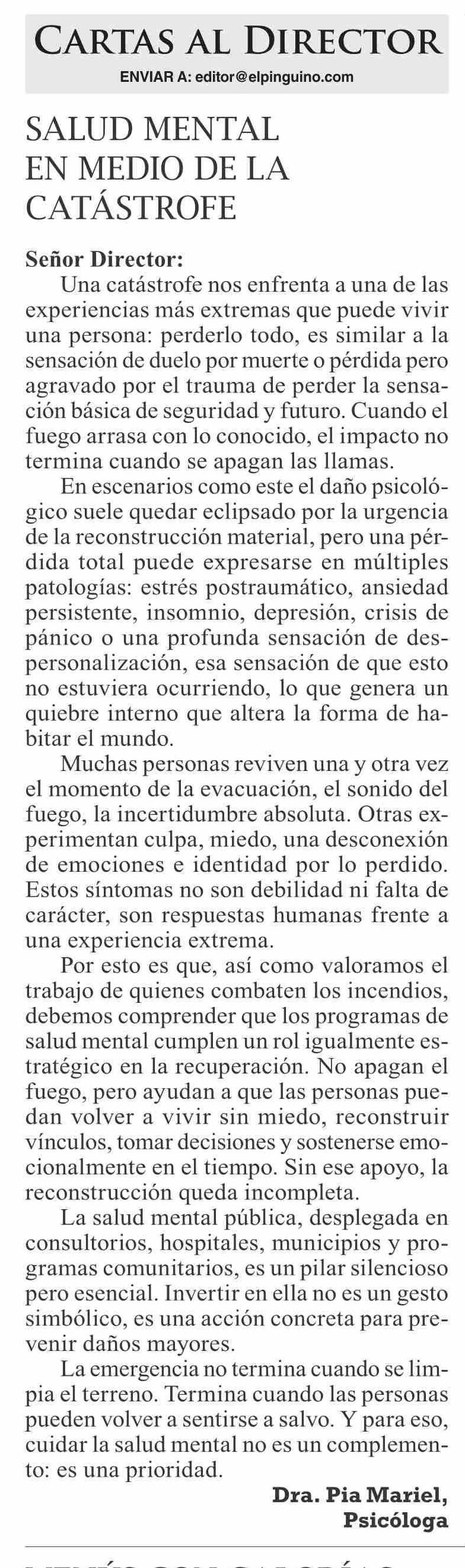 Título: Cartas: SALUD MENTAL EN MEDIO DE LA CATÁSTROFE
