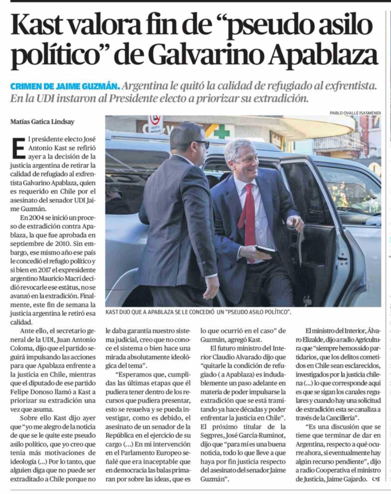Kast valora fin de "pseudo asilo político" de Galvarino Apablaza