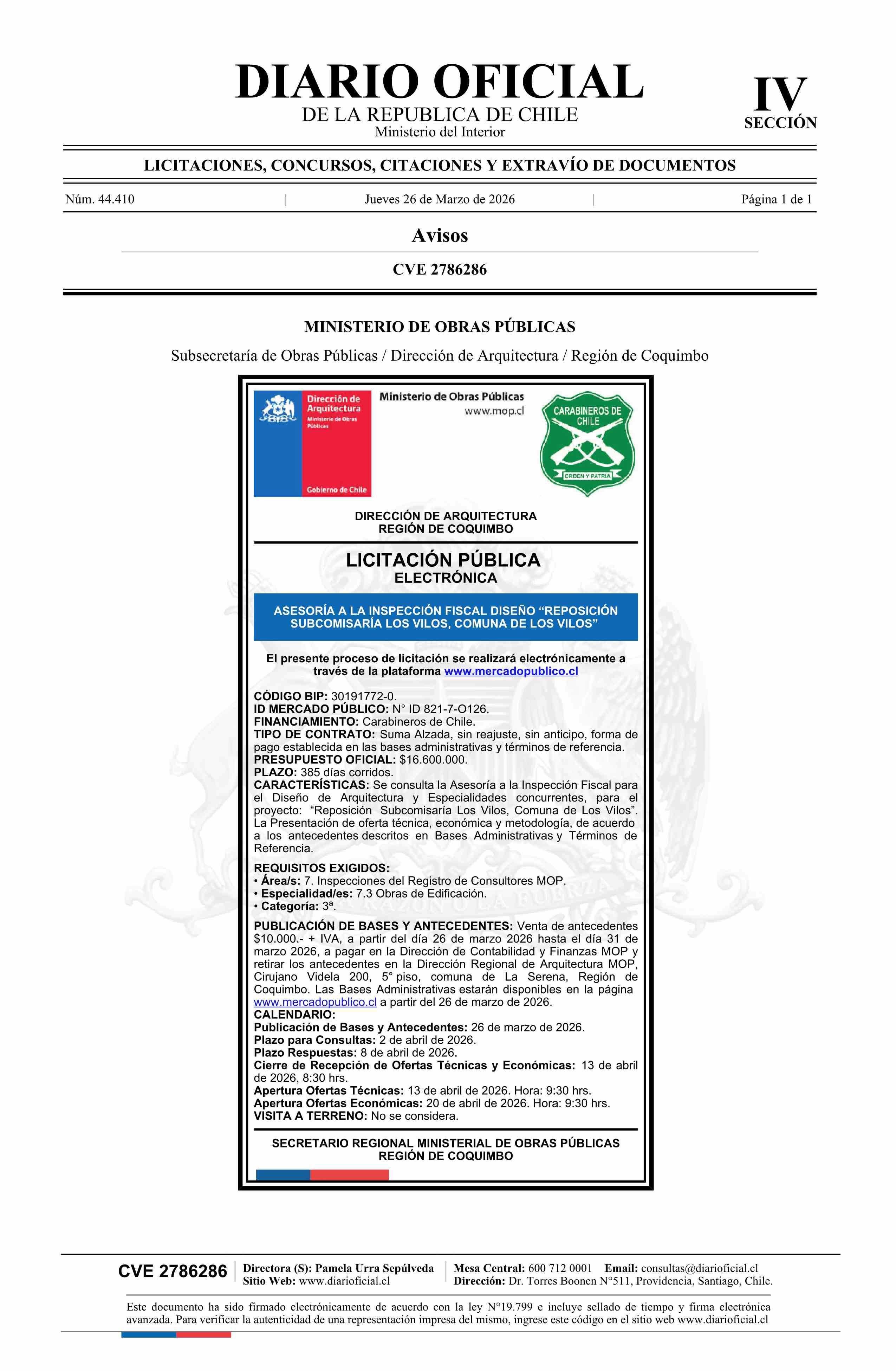| Título: | AVISO LICITACIONES: Asesoría a la Inspección Fiscal Diseño Reposición Subcomisaría Los Vilos, Comuna de Los Vilos |