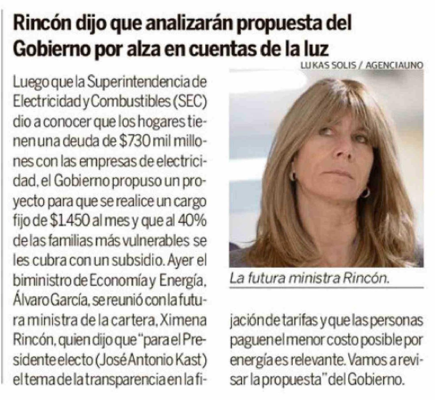 Rincón dijo que analizarán propuesta del Gobierno por alza en cuentas de la luz