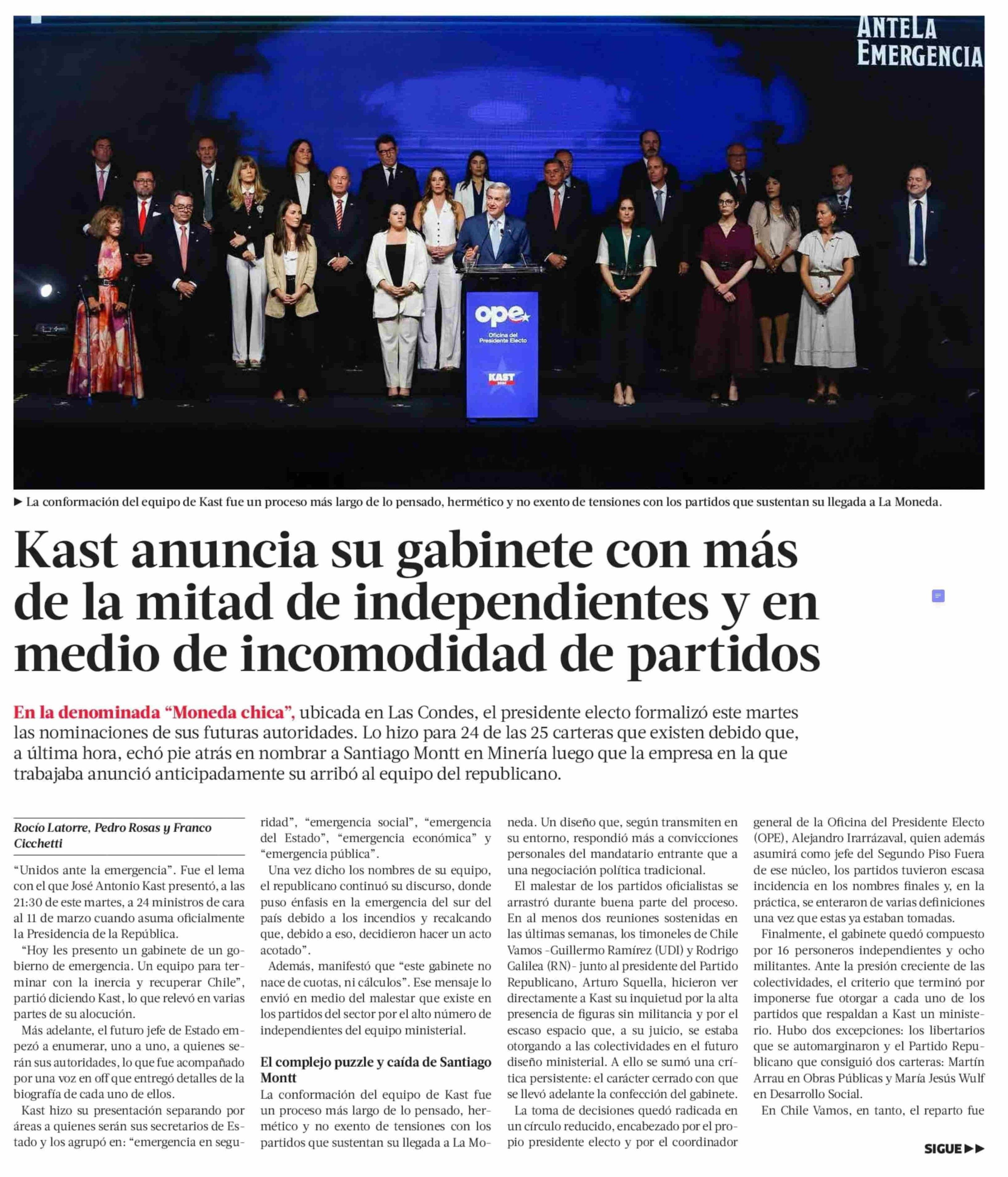 Kast anuncia su gabinete con más de la mitad de independientes y en medio de incomodidad de partidos