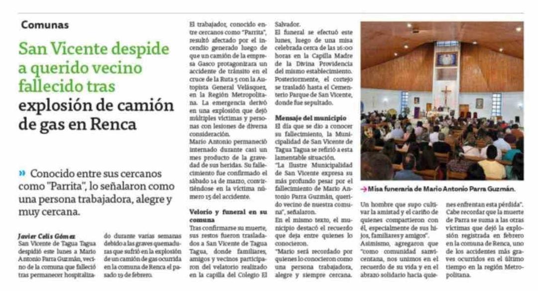 San Vicente despide a querido vecino fallecido tras explosión de camión de gas en Renca