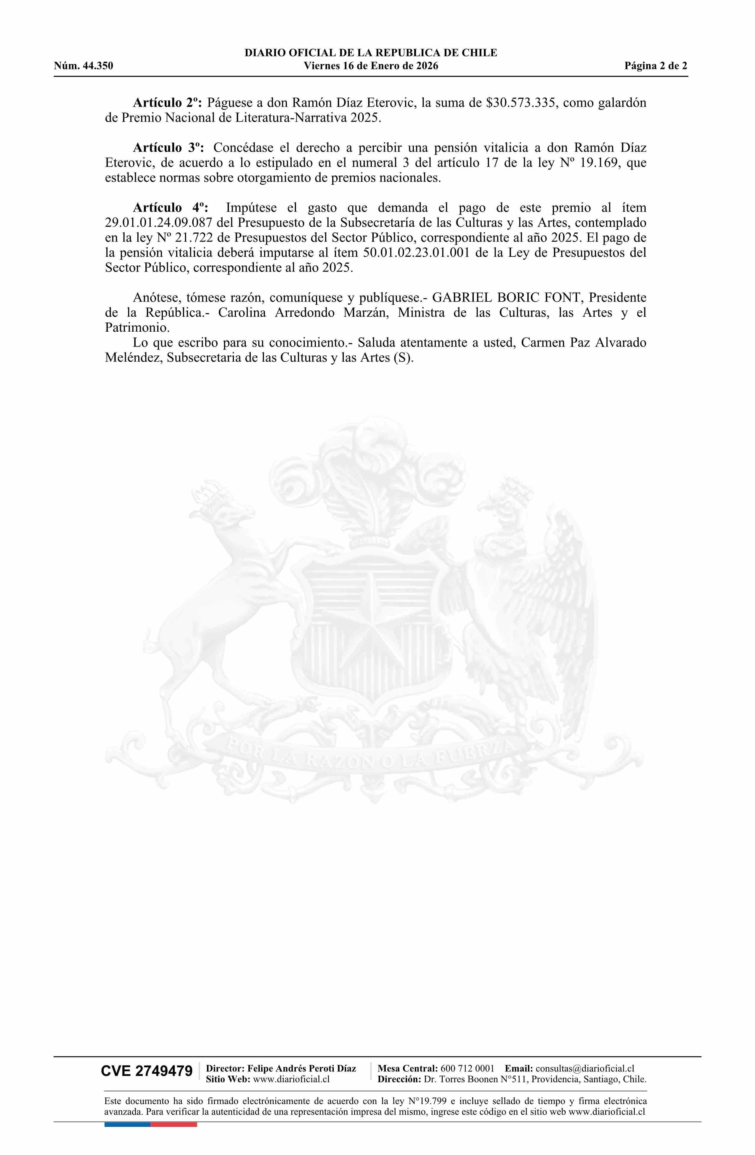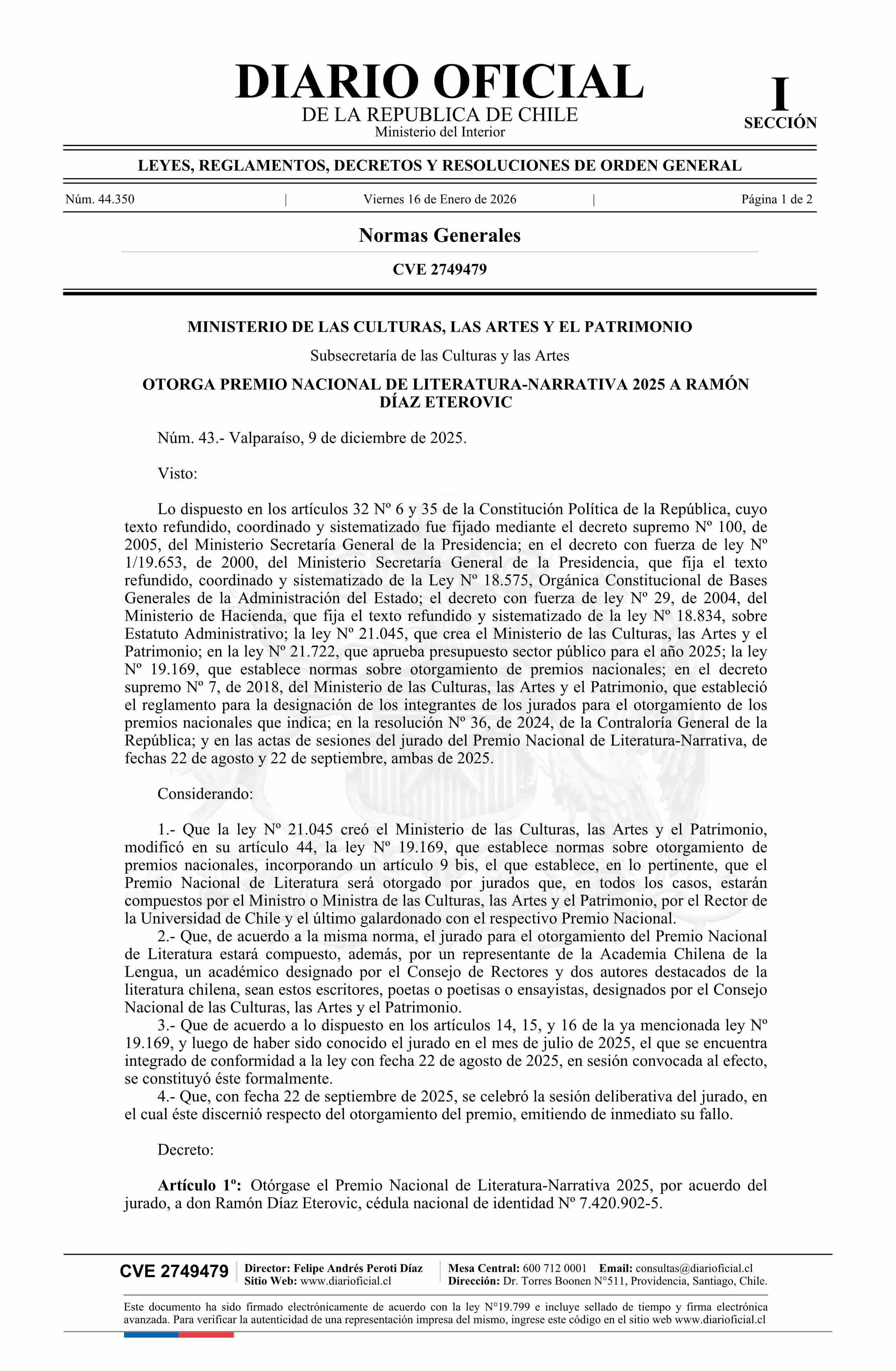 | Título: | Decreto número 43, de 2025.- Otorga Premio Nacional de Literatura-Narrativa 2025 a don Ramón Díaz Eterovic |