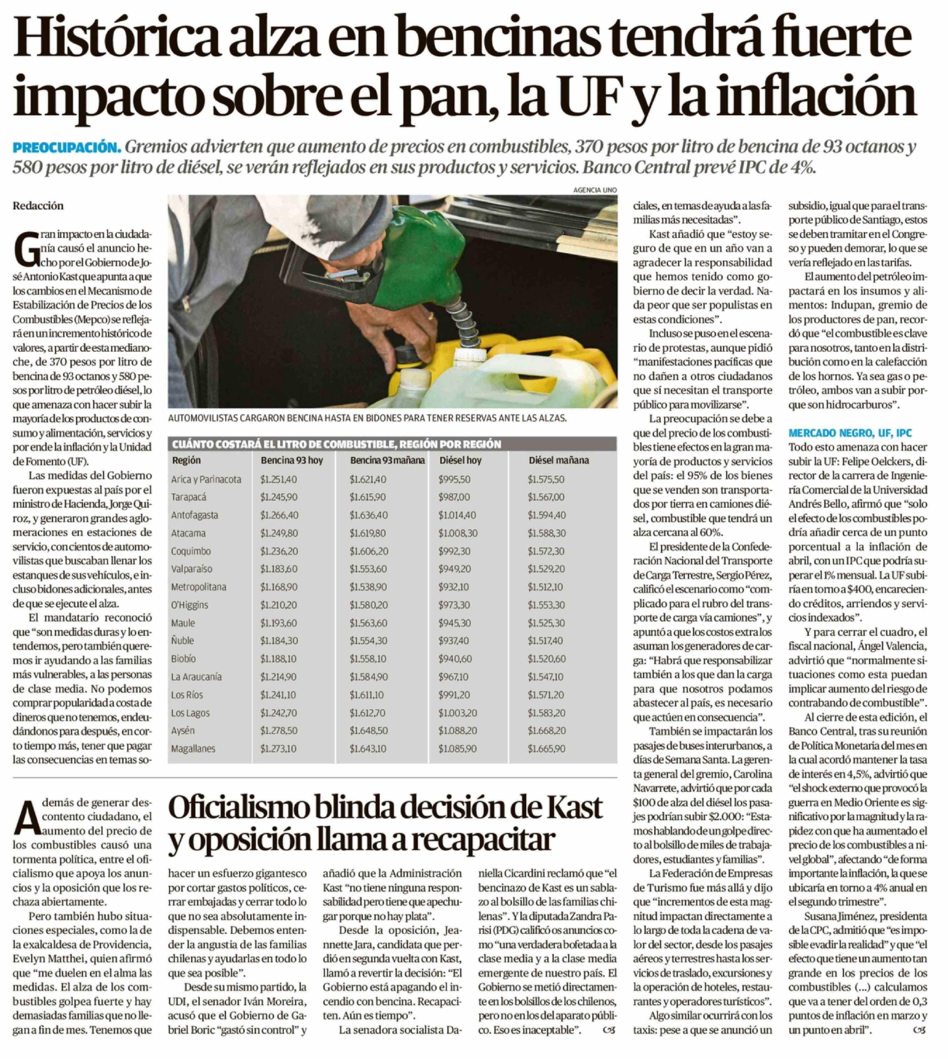 Histórica alza en bencinas tendrá fuerte impacto sobre el pan, la UF y la inflación