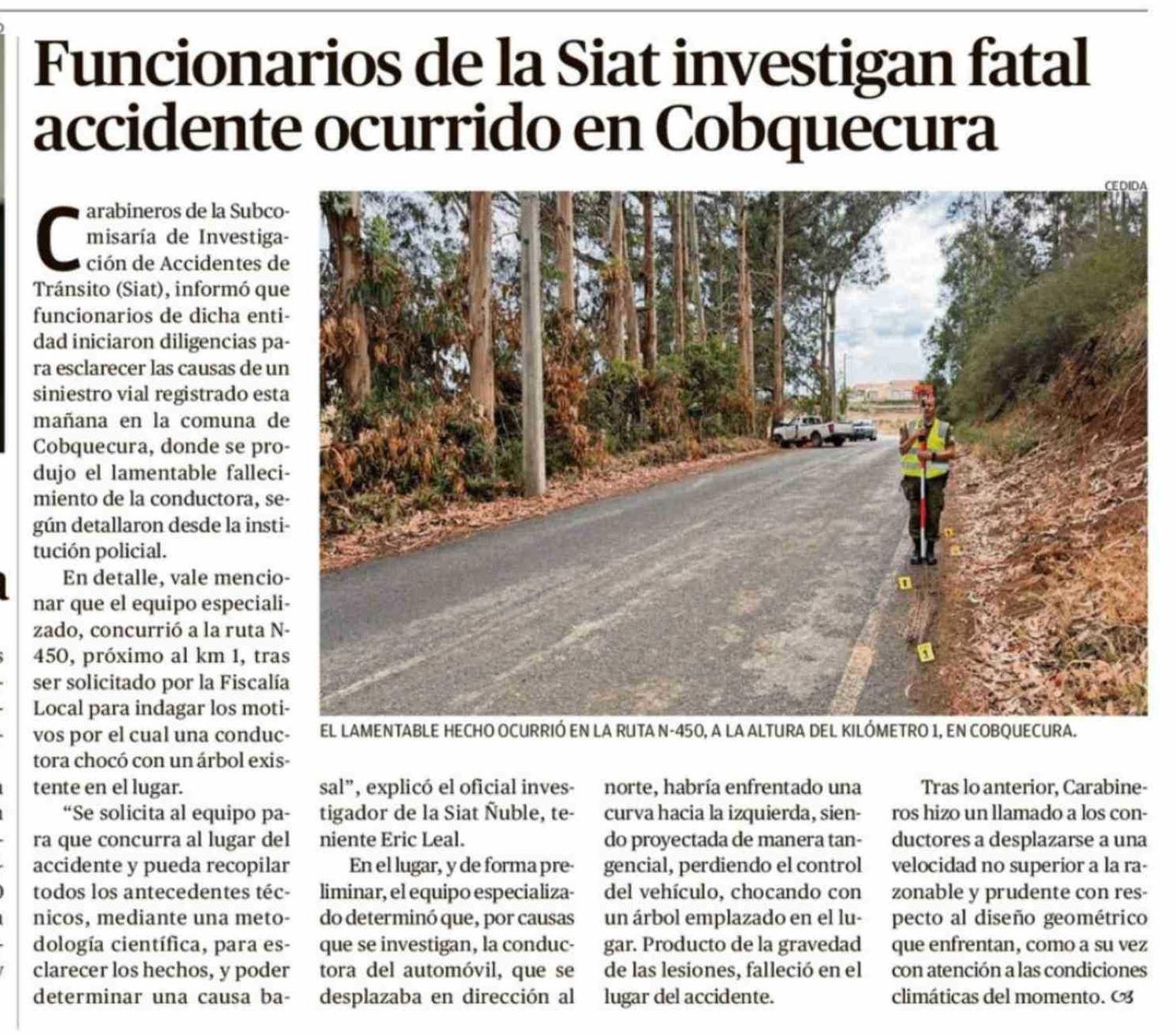 Funcionarios de la Siat investigan fatal accidente ocurrido en Cobquecura