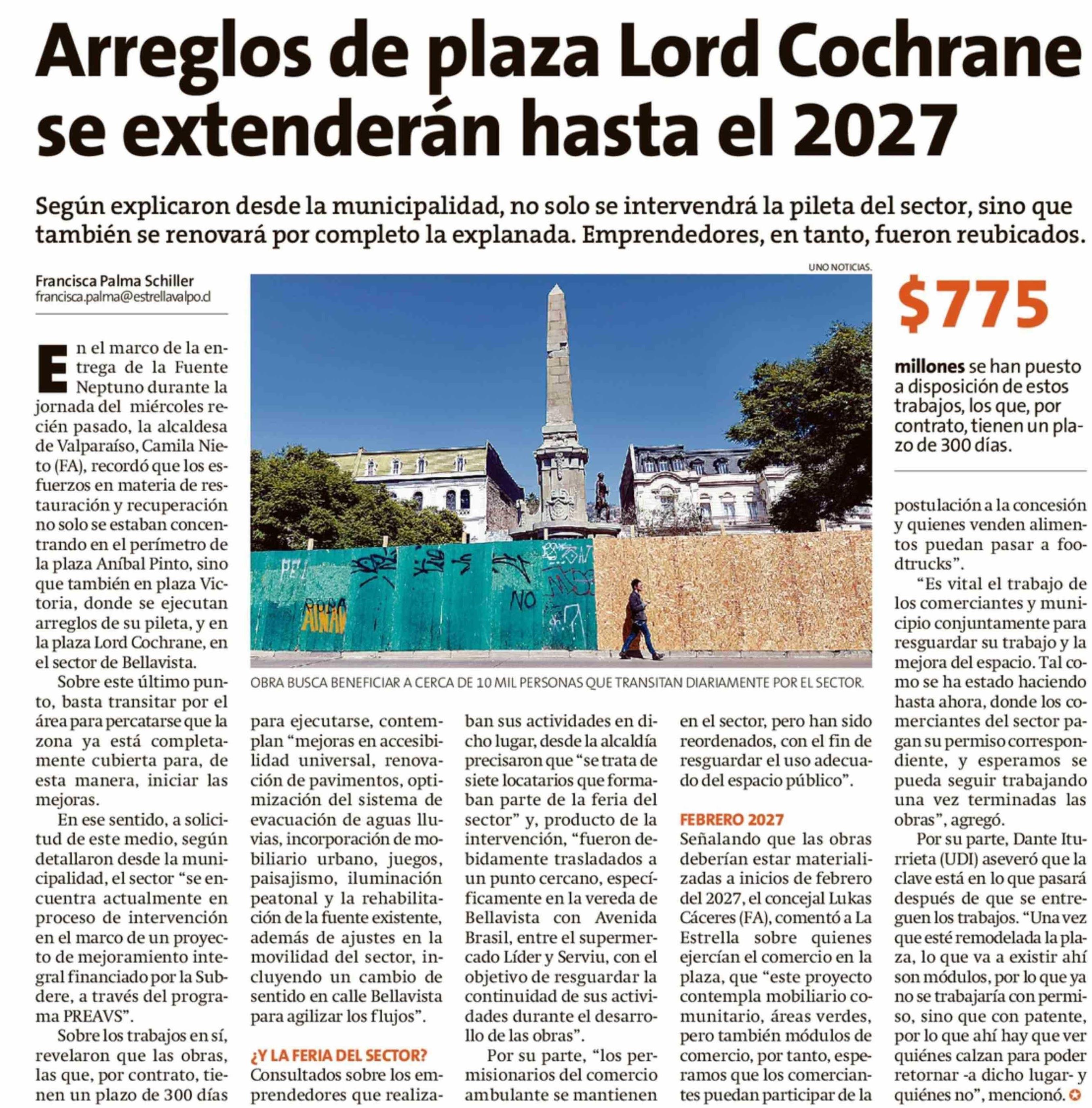 Arreglos de plaza Lord Cochrane se extenderán hasta el 2027