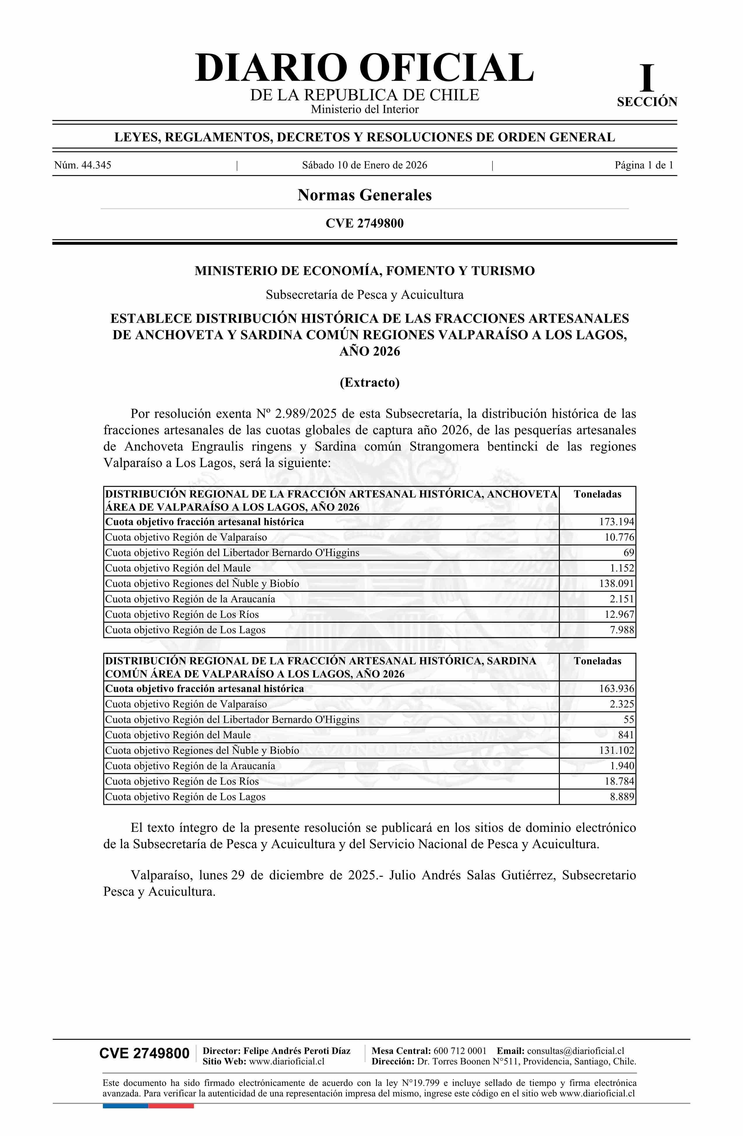 | Título: | Extracto de resolución exenta número 2.989, de 2025.- Establece distribución histórica de las fracciones artesanales de Anchoveta y Sardina común regiones Valparaíso a Los Lagos, año 2026 |