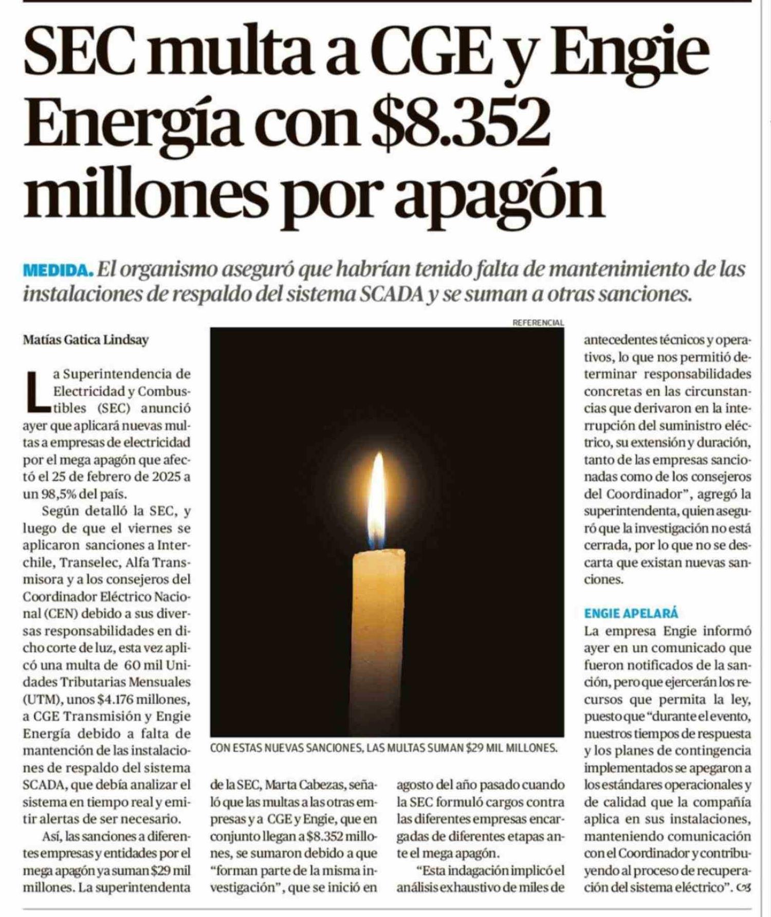 SEC multa a CGE y Engie Energía con $8.352 millones por apagón