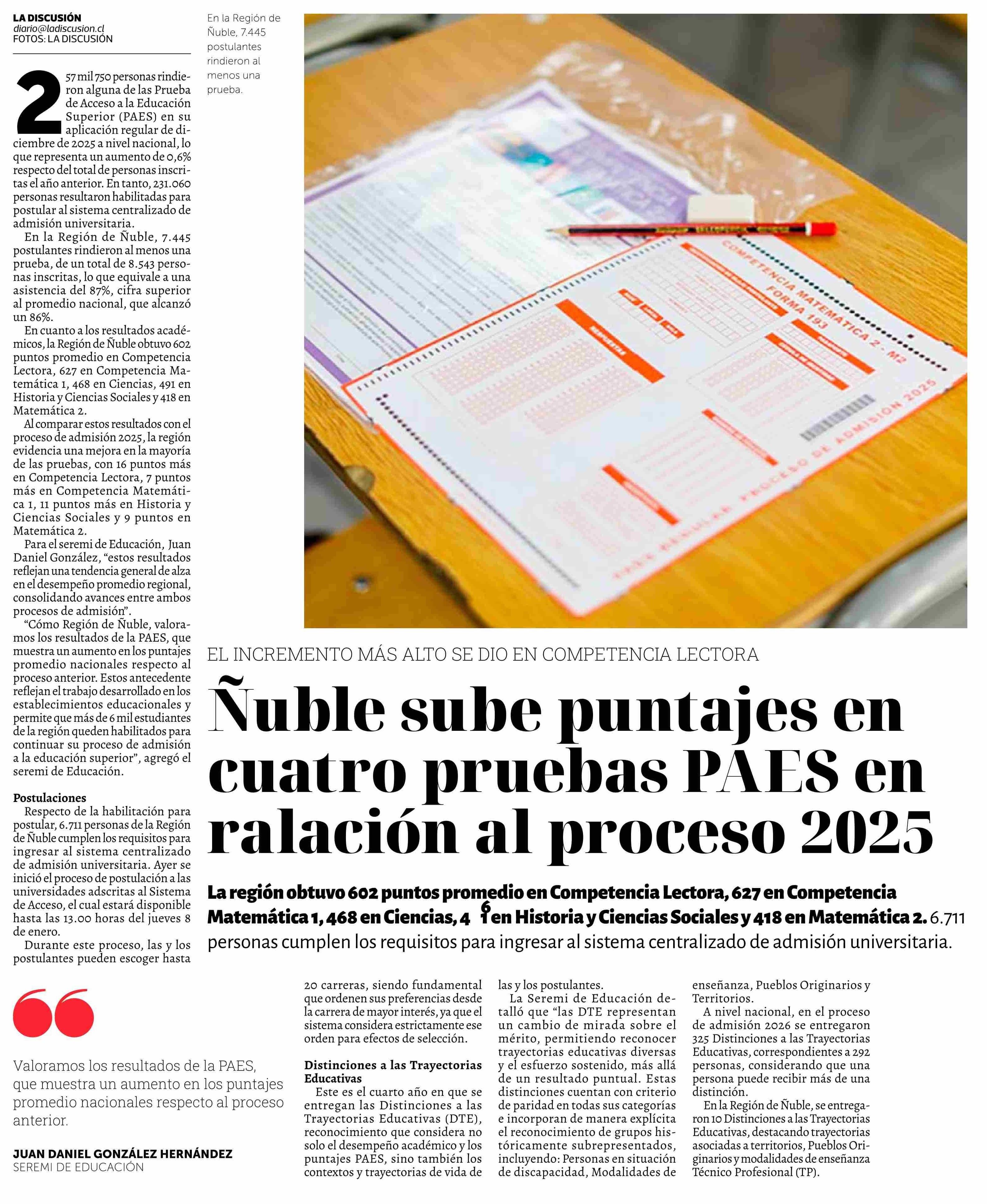 Nuble sube puntajes en cuatro pruebas PAES en ralación al proceso 2025