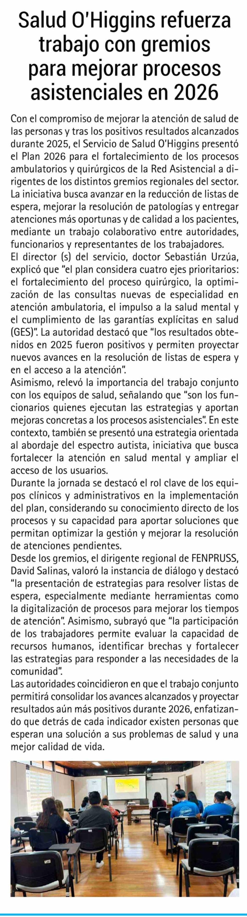 Salud O'Higgins refuerza trabajo con gremios para mejorar procesos asistenciales en 2026