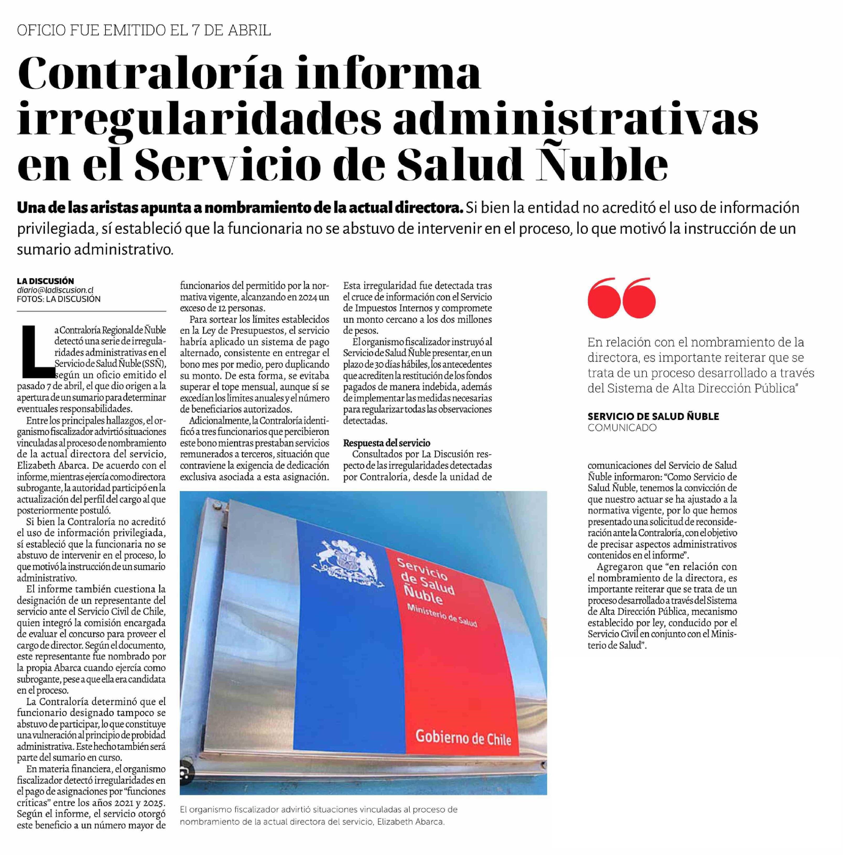 Contraloría informa irregularidades administrativas en el Servicio de Salud Ñuble