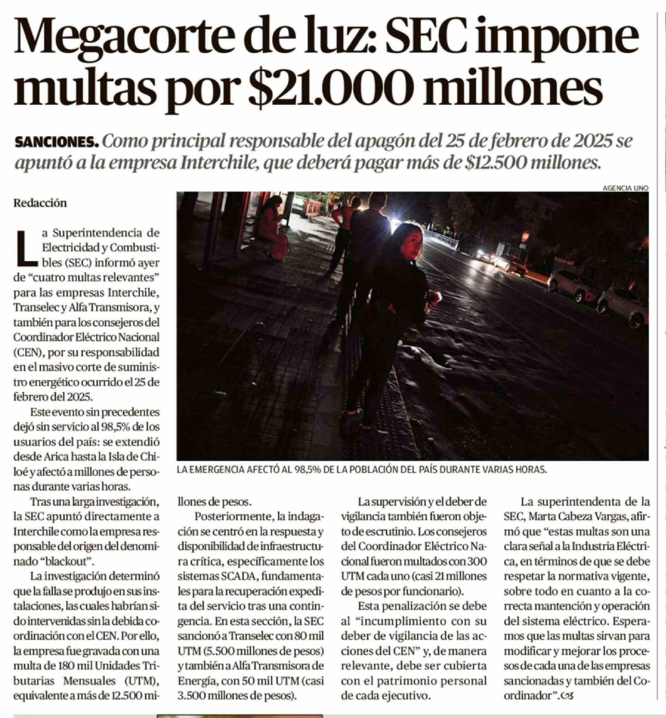 Megacorte de luz: SEC impone multas por $21.000 millones