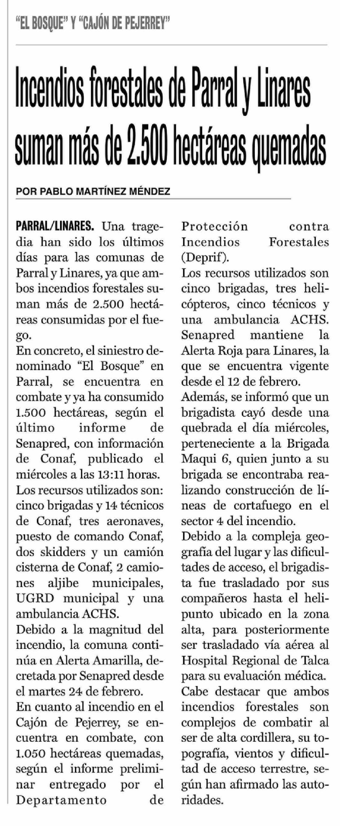 Incendios forestales de Parral y Linares suman más de 2.500 hectáreas quemadas