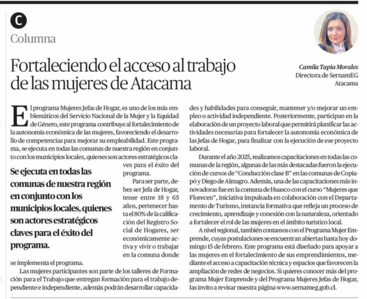 Columnas de Opinión: Fortaleciendo el acceso al trabajo de las mujeres de Atacama
