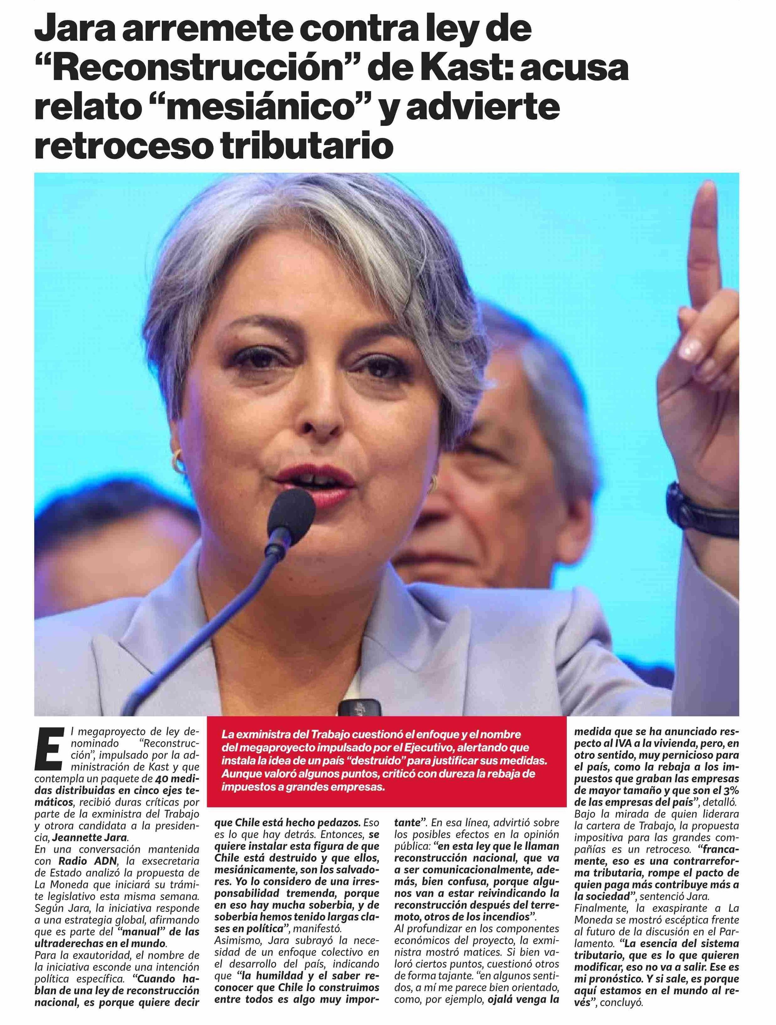 Jara arremete contra ley de “Reconstrucción” de Kast: acusa relato “mesiánico” y advierte retroceso tributario