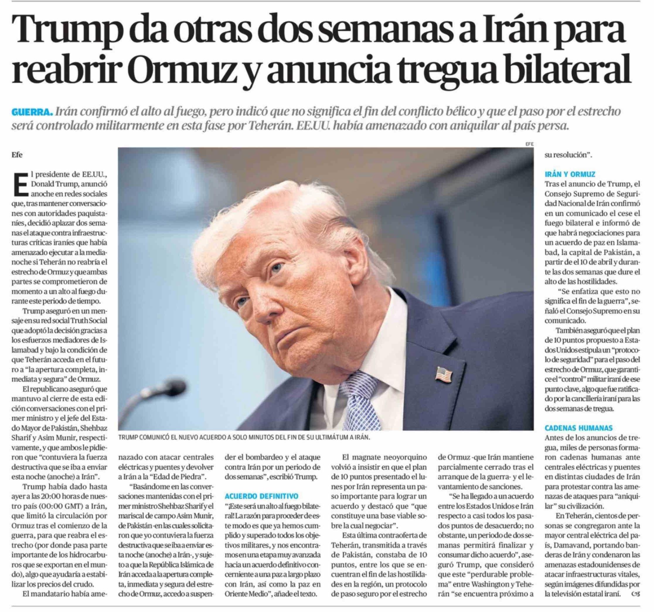 Trump da otras dos semanas a Irán para reabrir Ormuz y anuncia tregua bilateral