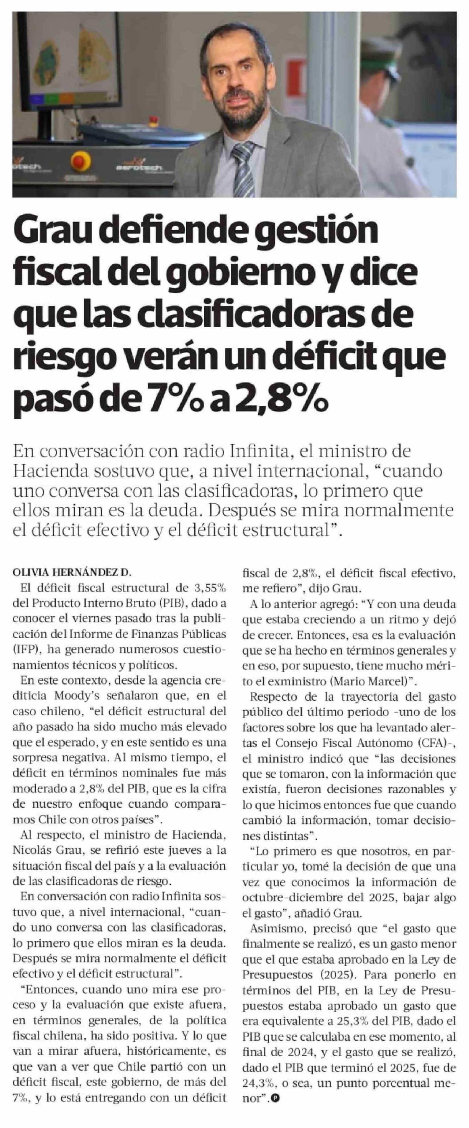 Grau defiende gestión fiscal del gobierno y dice que las clasificadoras de riesgo verán un déficit que pasó de 7% a 2,8%
