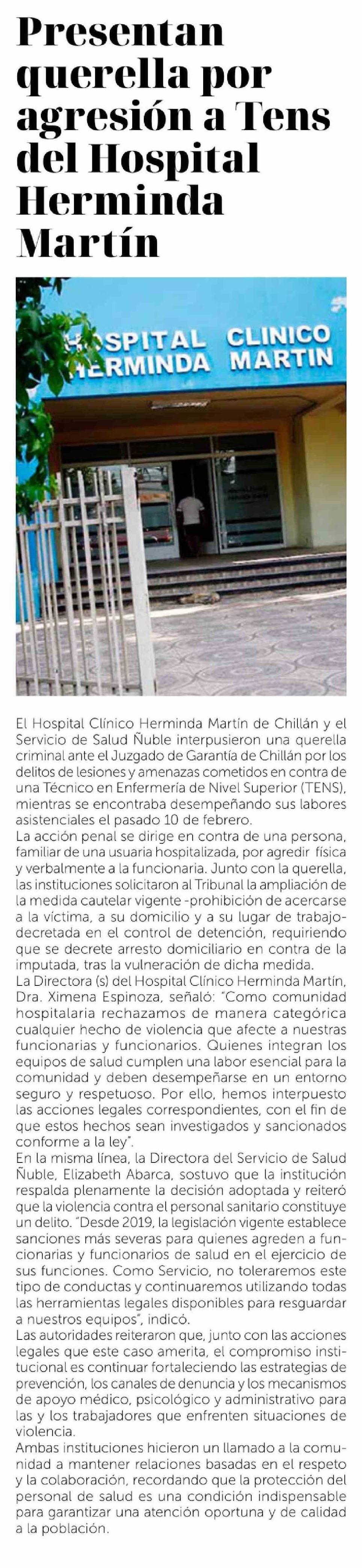 Presentan querella por agresión a Tens del Hospital Herminda Martín