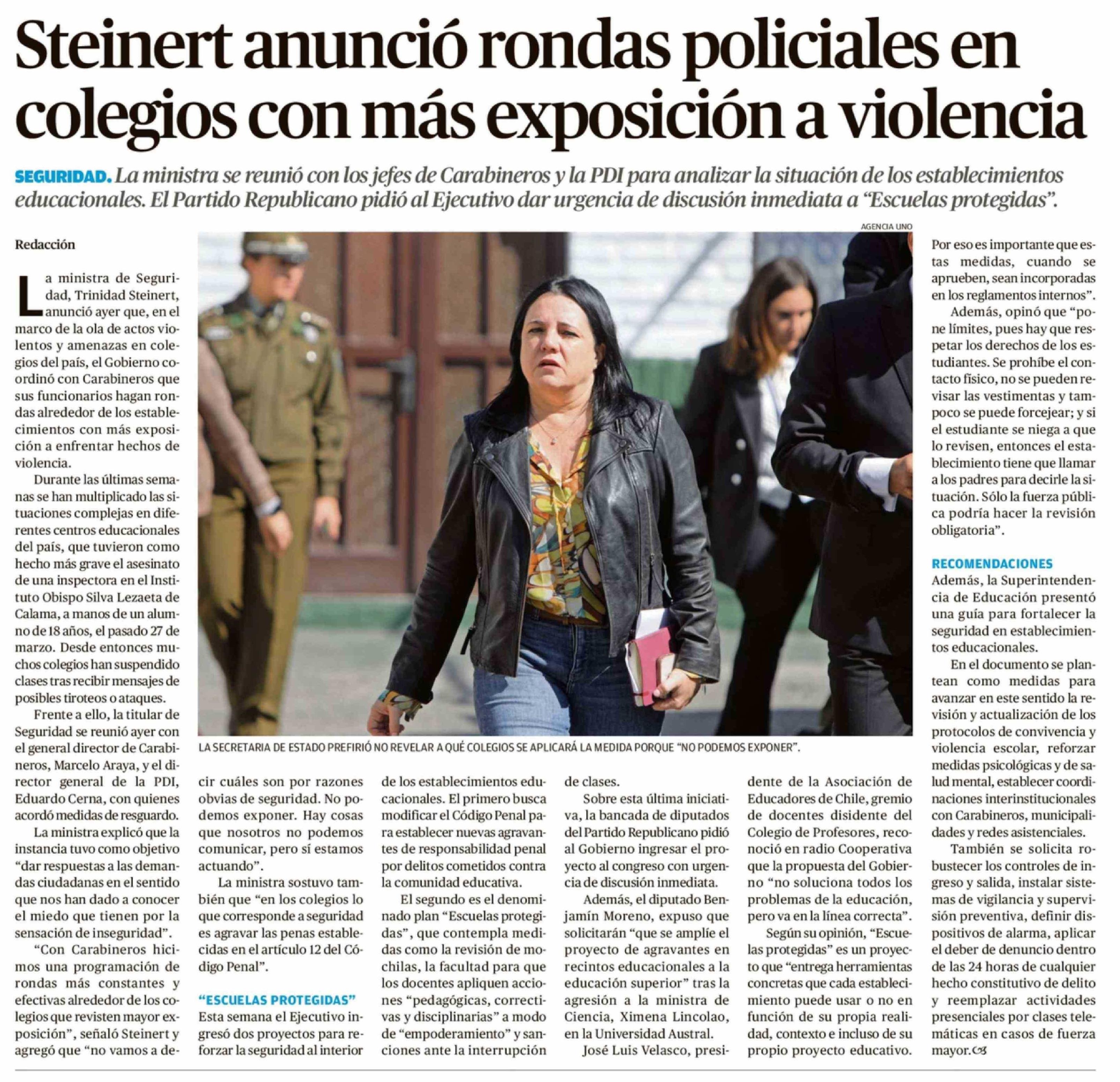 Steinert anunció rondas policiales en colegios con más exposición a violencia