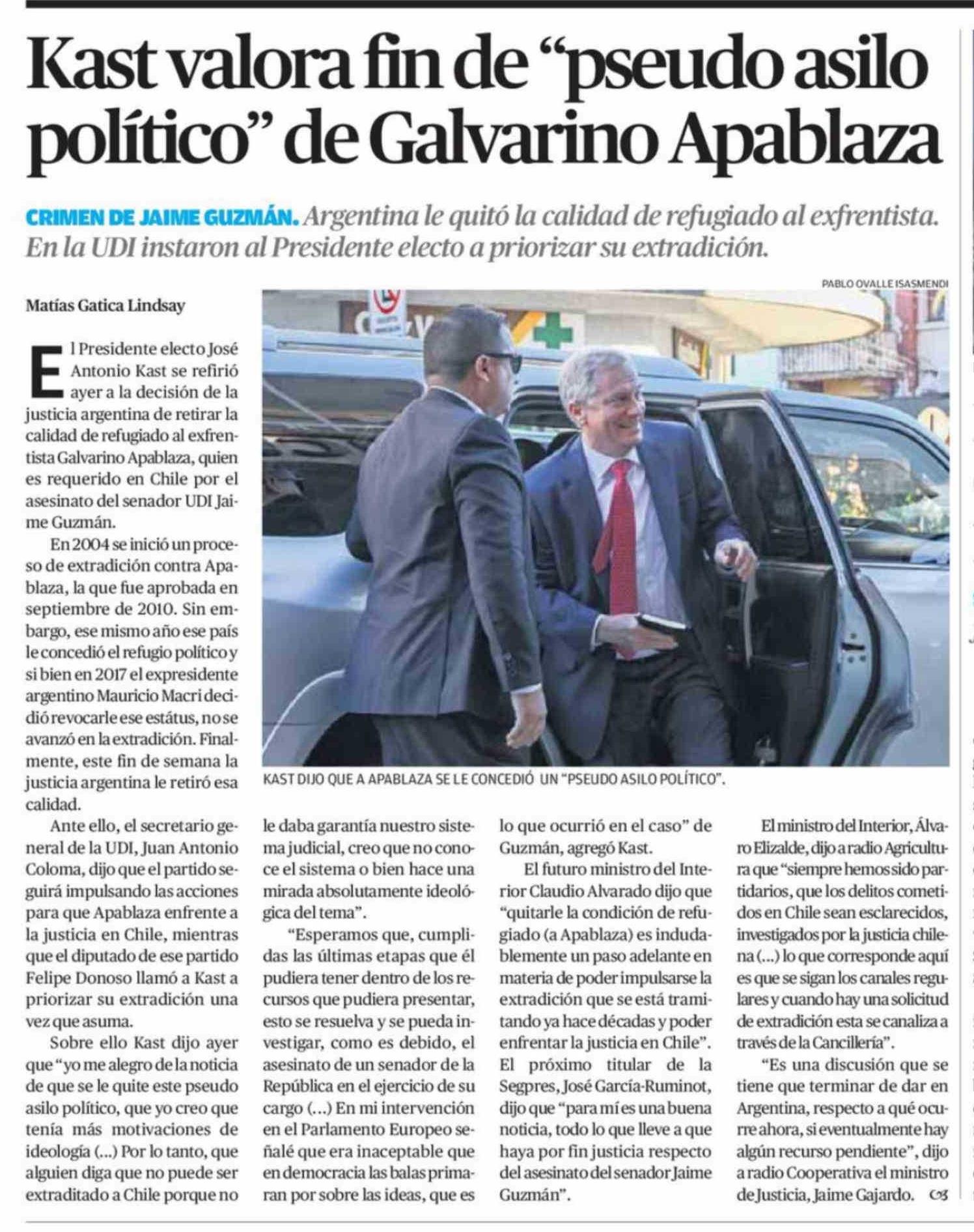 Kast valora fin de "pseudo asilo político" de Galvarino Apablaza