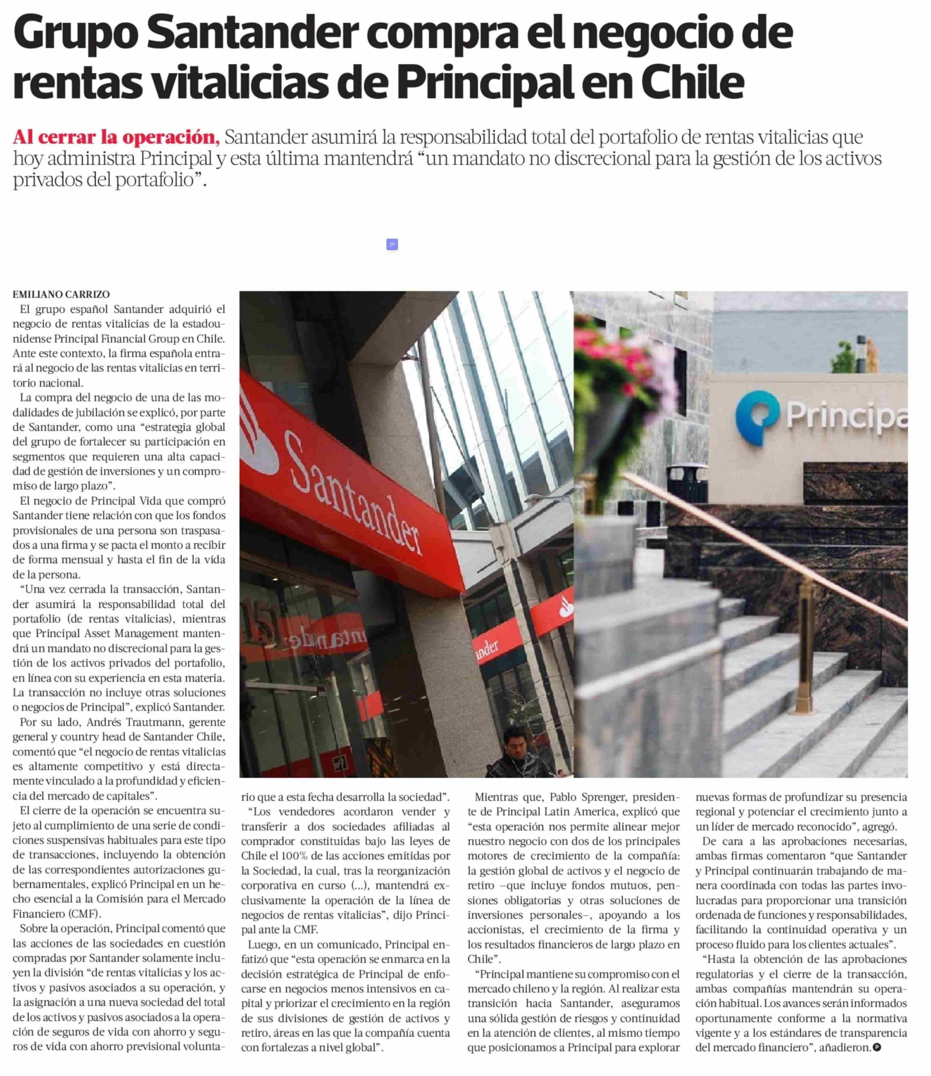Grupo Santander compra el negocio de rentas vitalicias de Principal en Chile