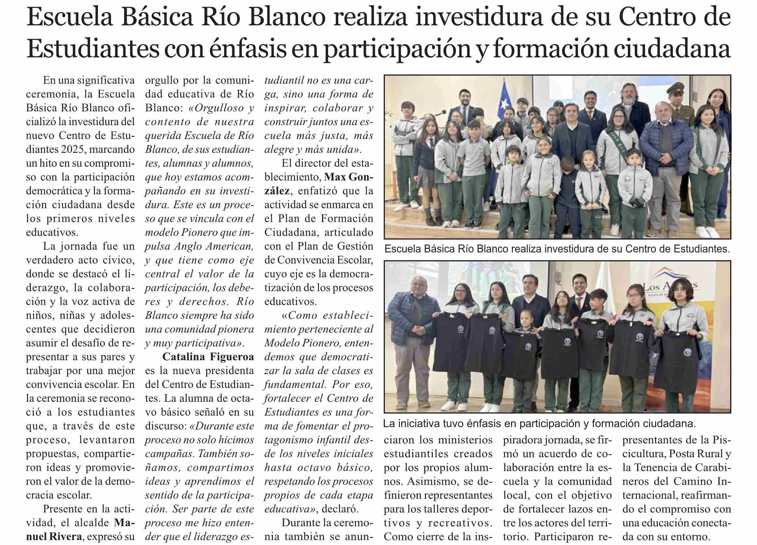 Escuela Básica Río Blanco realiza investidura de su Centro de Estudiantes con énfasis en participación y formación ciudadana
