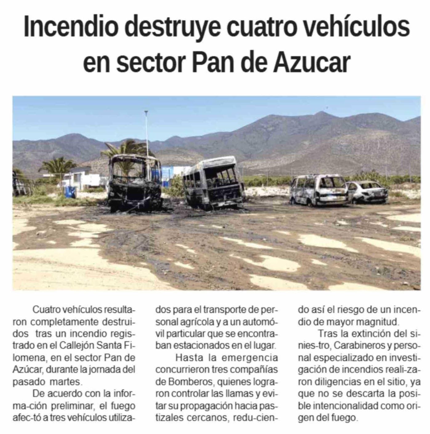 Incendio destruye cuatro vehículos en sector Pan de Azucar