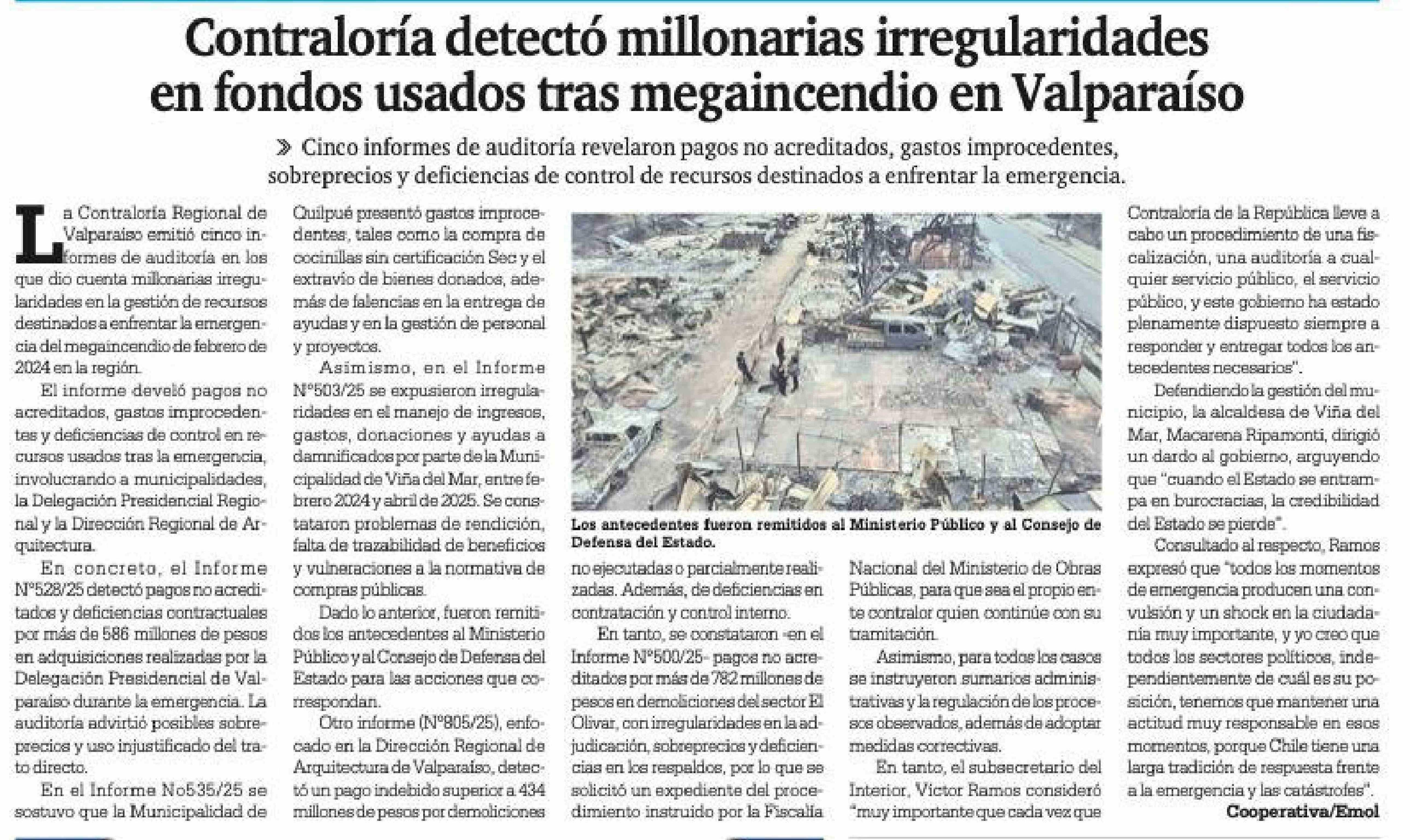 Contraloría detectó millonarias irregularidades en fondos usados tras megaincendio en Valparaíso
