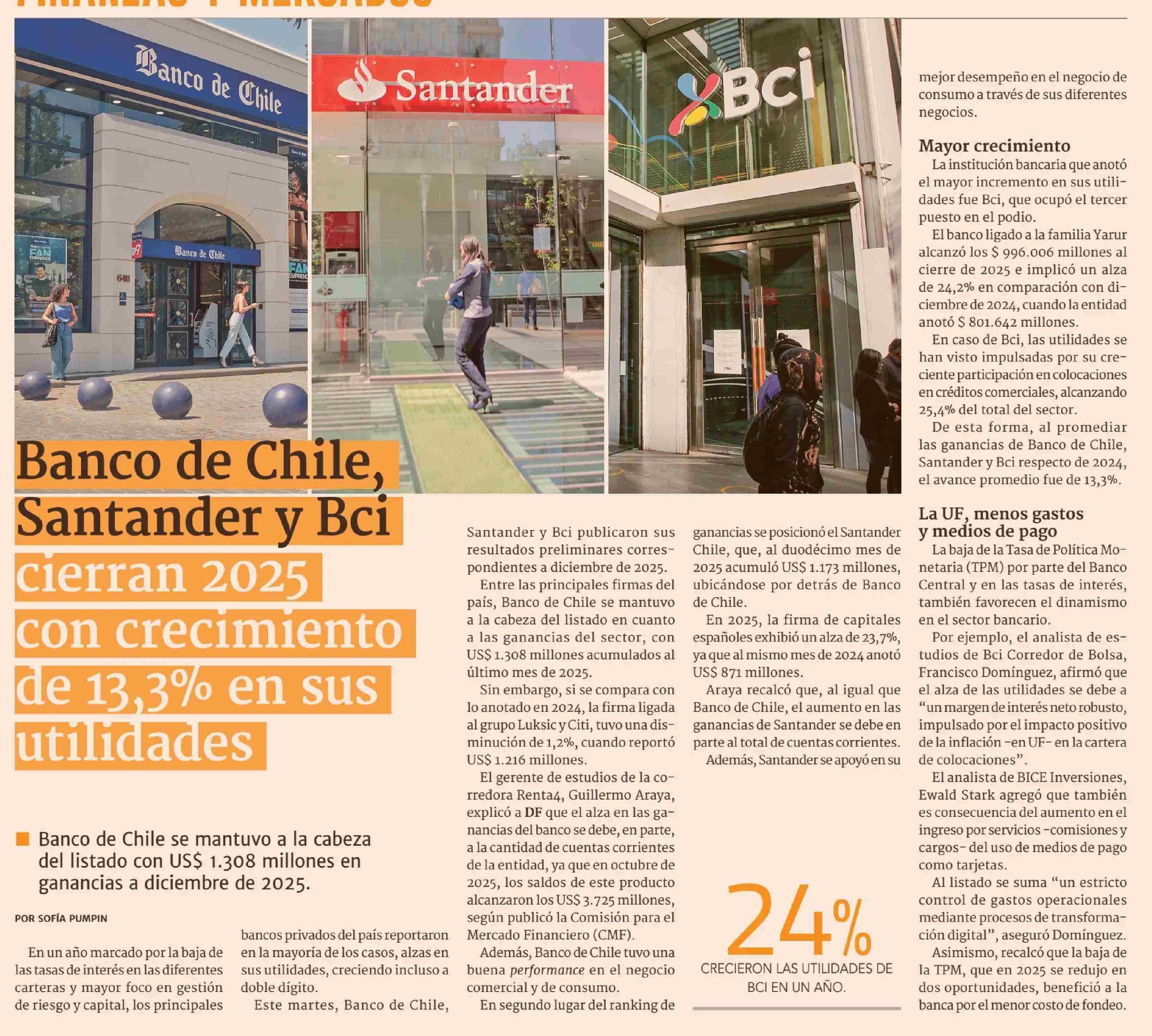 Banco de Chile, Santander y Bci Cierran 2025 con crecimiento de 13,3% en sus utilidades