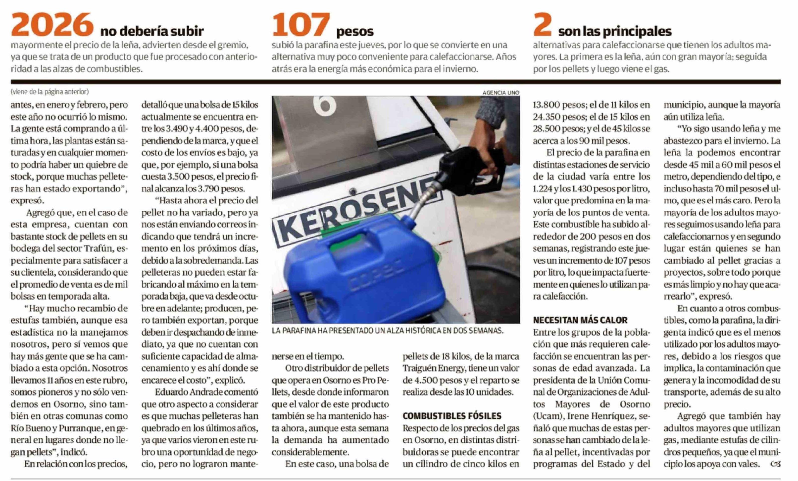 Leña y pellets mantienen precios, pero suben la parafina y el gas