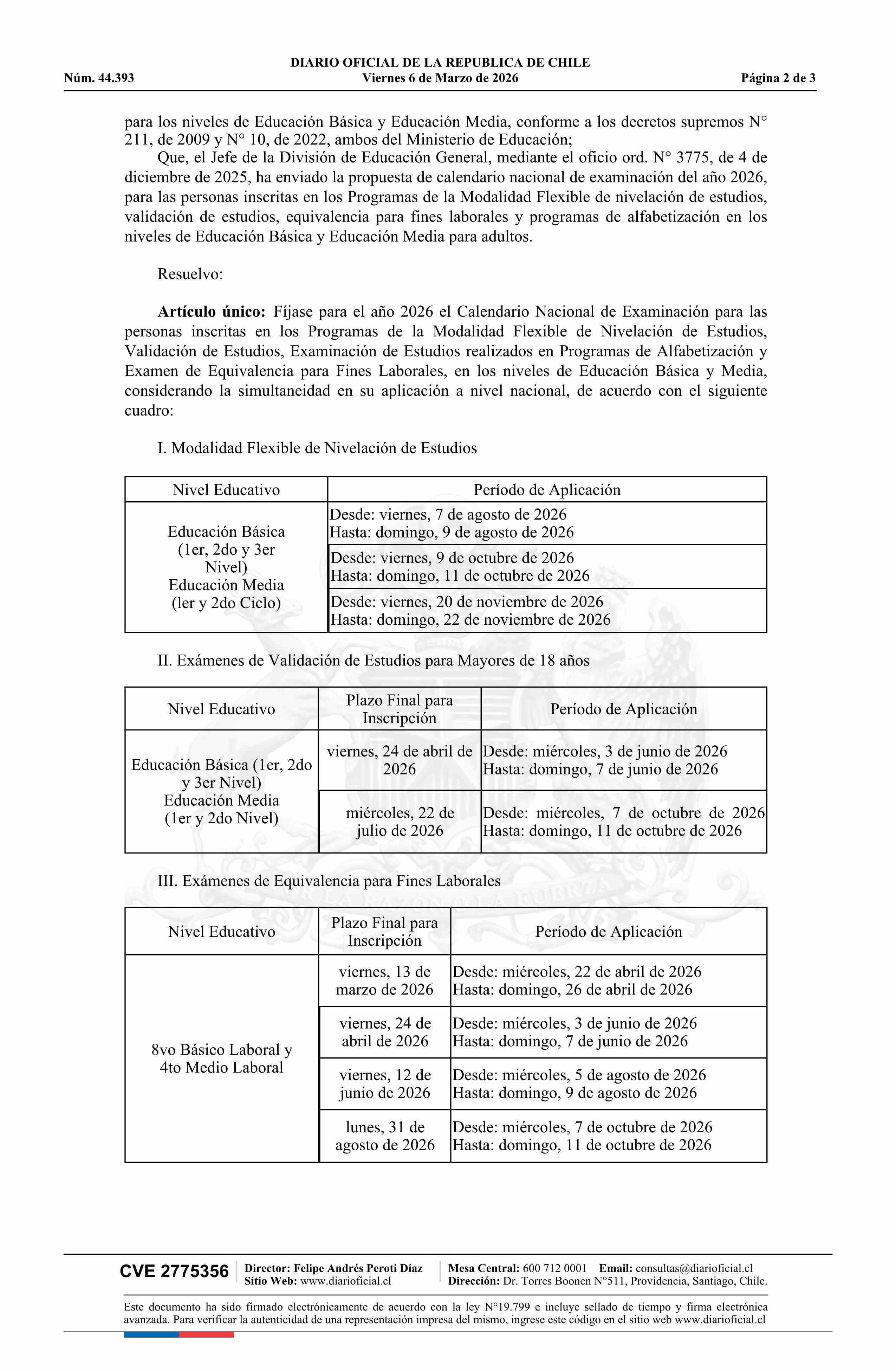 | Título: | Resolución exenta número 814, de 2026.- Fija para el año 2026 el calendario nacional de examinación para los Niveles de Educación Básica y Media para Adultos |