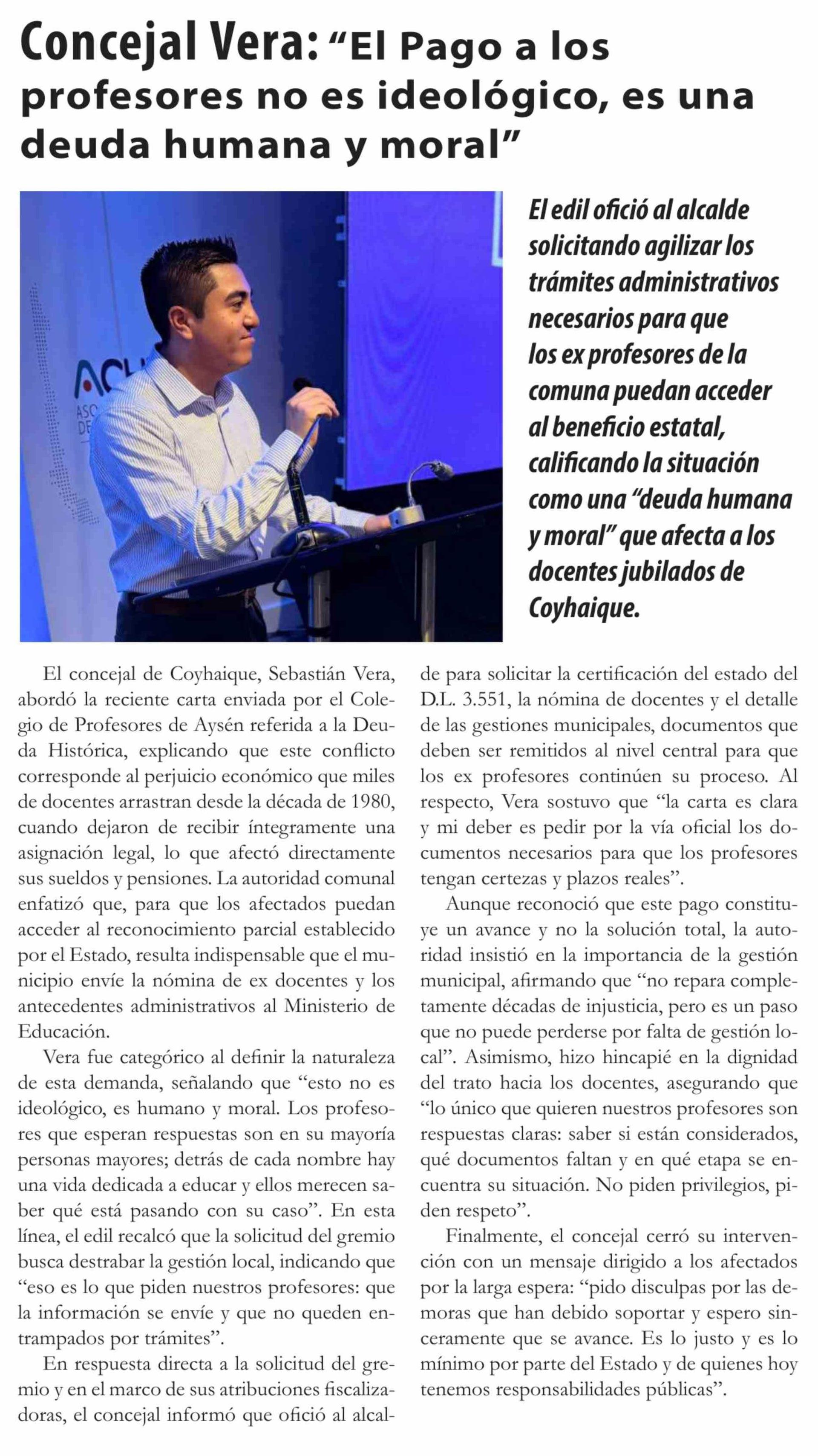 Concejal Vera: "El Pago a los profesores no es ideológico, es una deuda humana y moral"