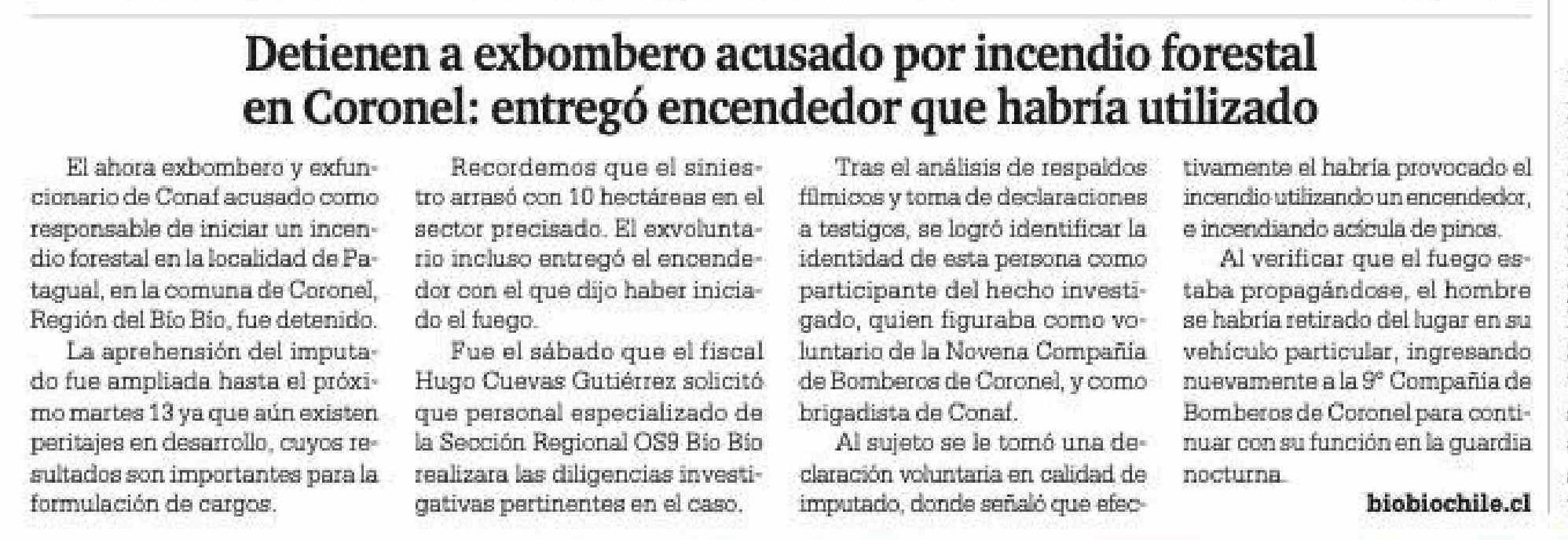 Detienen a exbombero acusado por incendio forestal en Coronel: entregó encendedor que habría utilizado