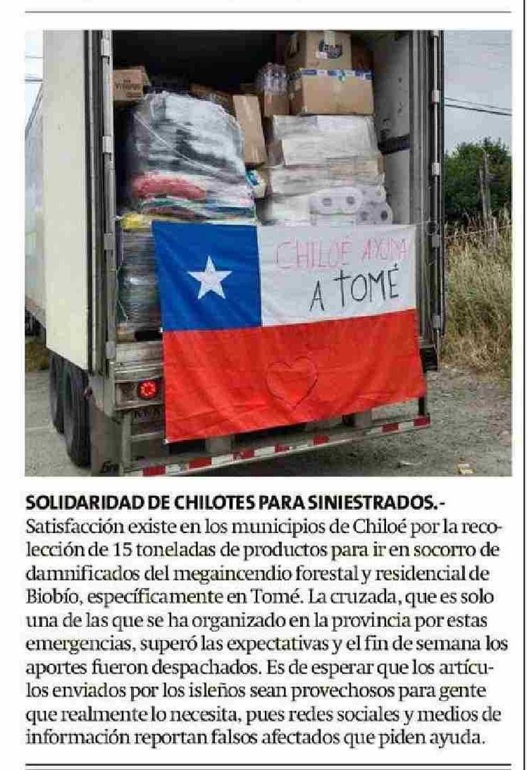 Título: SOLIDARIDAD DE CHILOTES PARA SINIESTRADOS .Satisfacción existe en los municipios de Chiloé por la recolección de 15 toneladas de productos para ir en socorro de damnificados del megaincendio forestal y residencial de Biobío, específicamente en Tomé. La cruzada, que es solo una de las que se ha organ