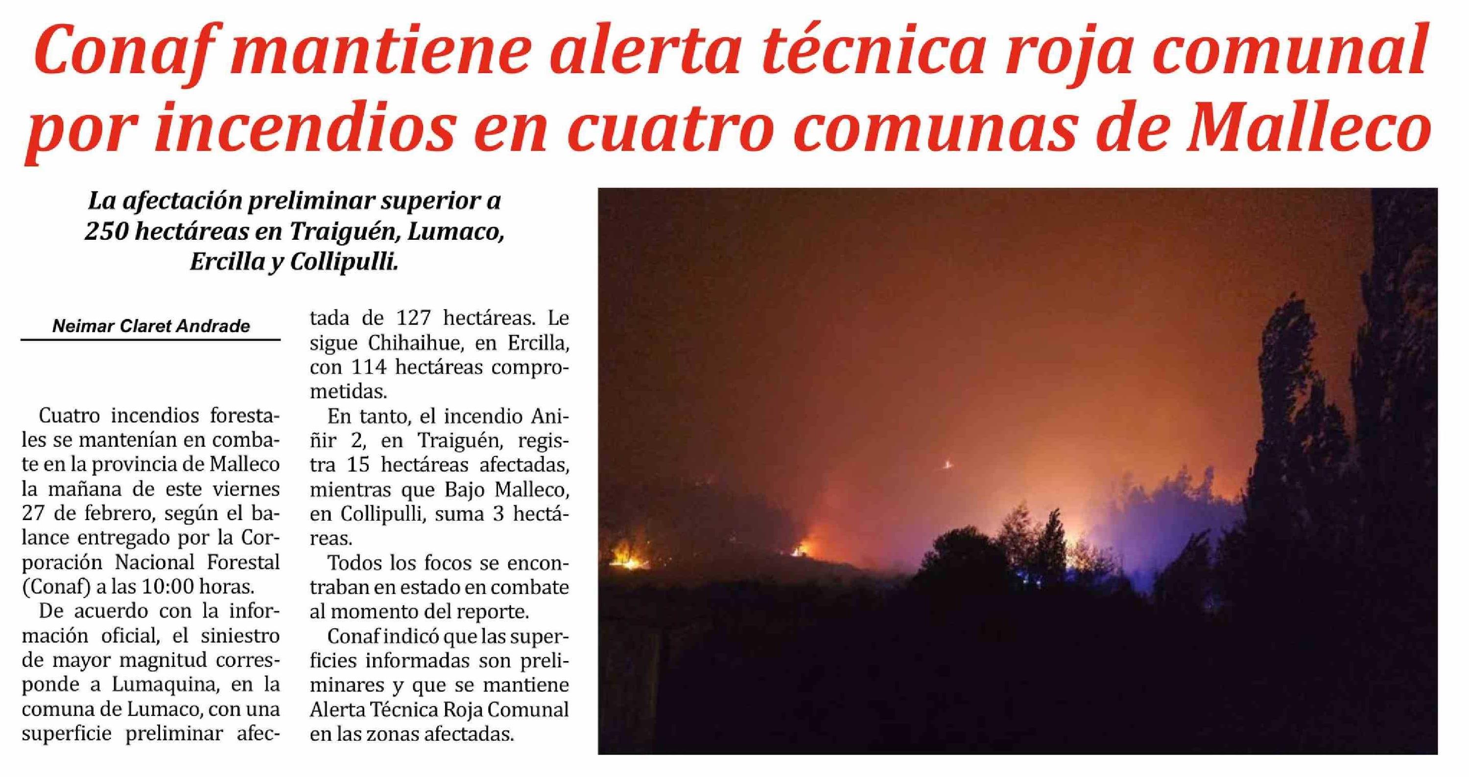 Conaf mantiene alerta técnica roja comunal por incendios en cuatro comunas de Malleco