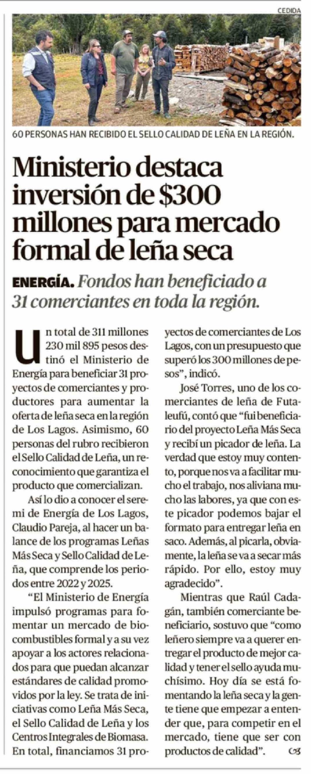 Ministerio destaca inversión de $300 millones para mercado formal de leña seca
