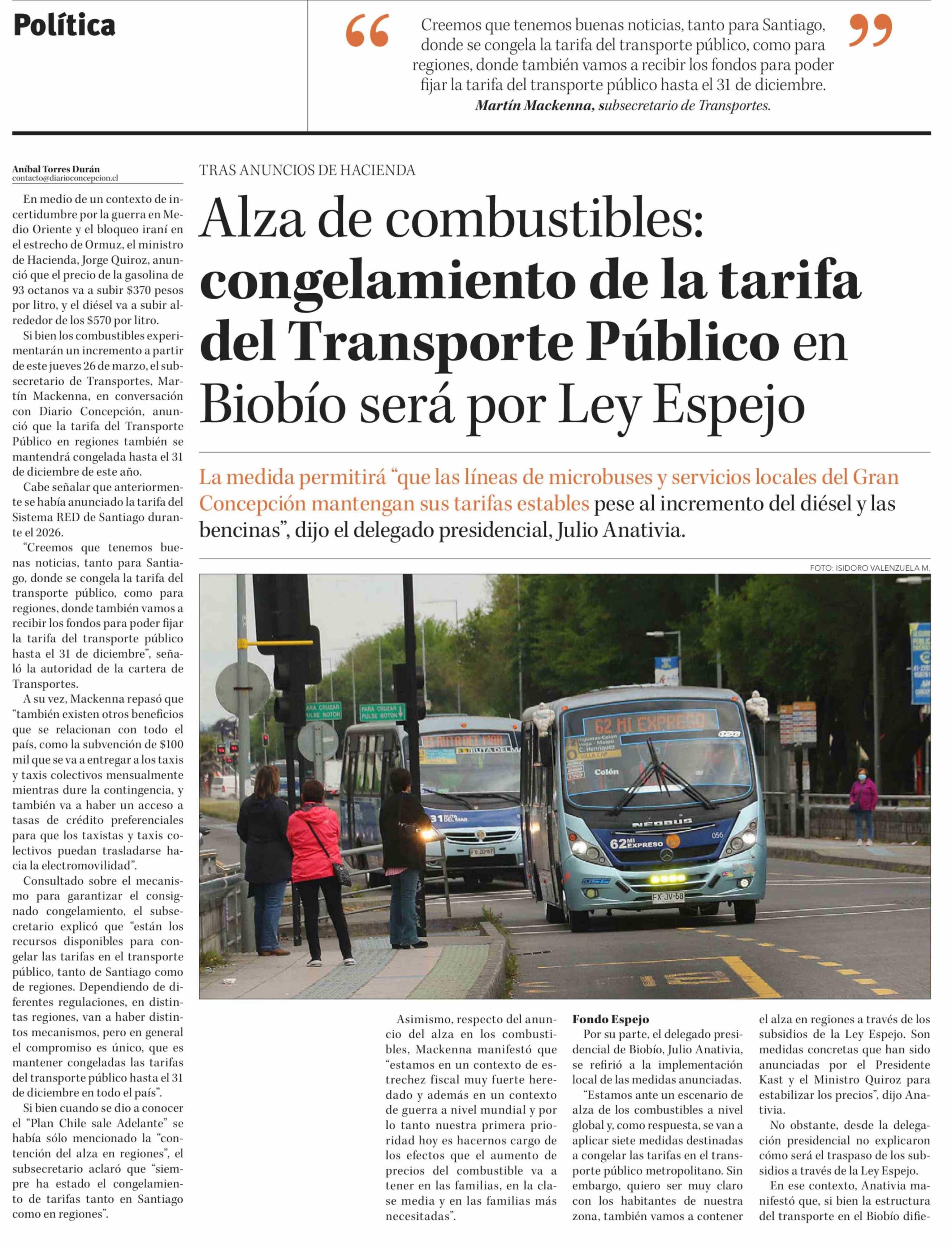 Alza de combustibles: congelamiento de la tarifa del Transporte Público en Biobío será por Ley Espejo