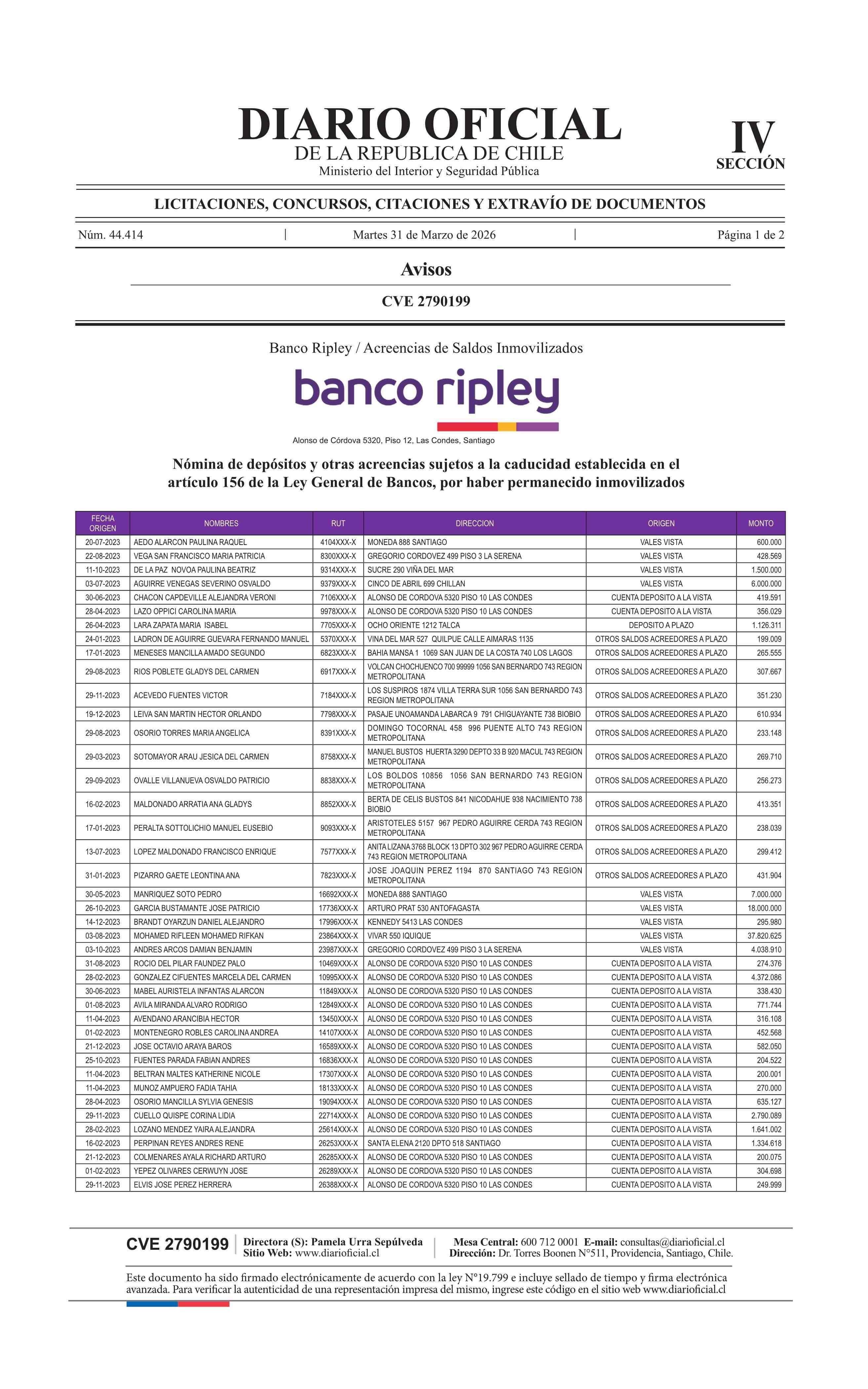 | Título: | AVISO LICITACIONES: BANCO RIPLEY: Nómina de depósitos y otras acreencias sujetos a la caducidad establecida en el artículo 156 de la Ley General de Bancos, por haber permanecido inmovilizados |
