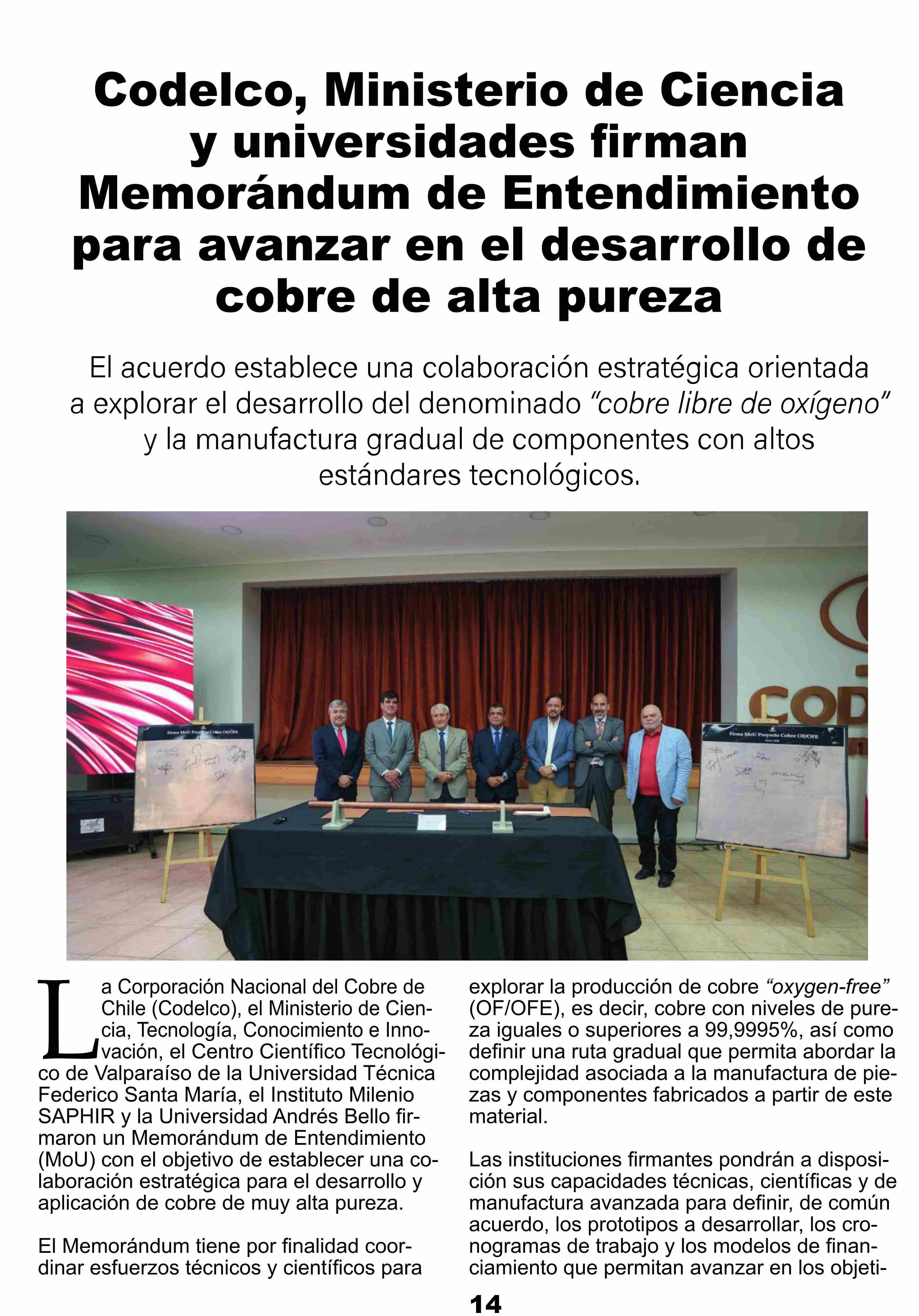 | Título: | Codelco, Ministerio de Ciencia y universidades firman Memorándum de Entendimiento para avanzar en el desarrollo de cobre de alta pureza |