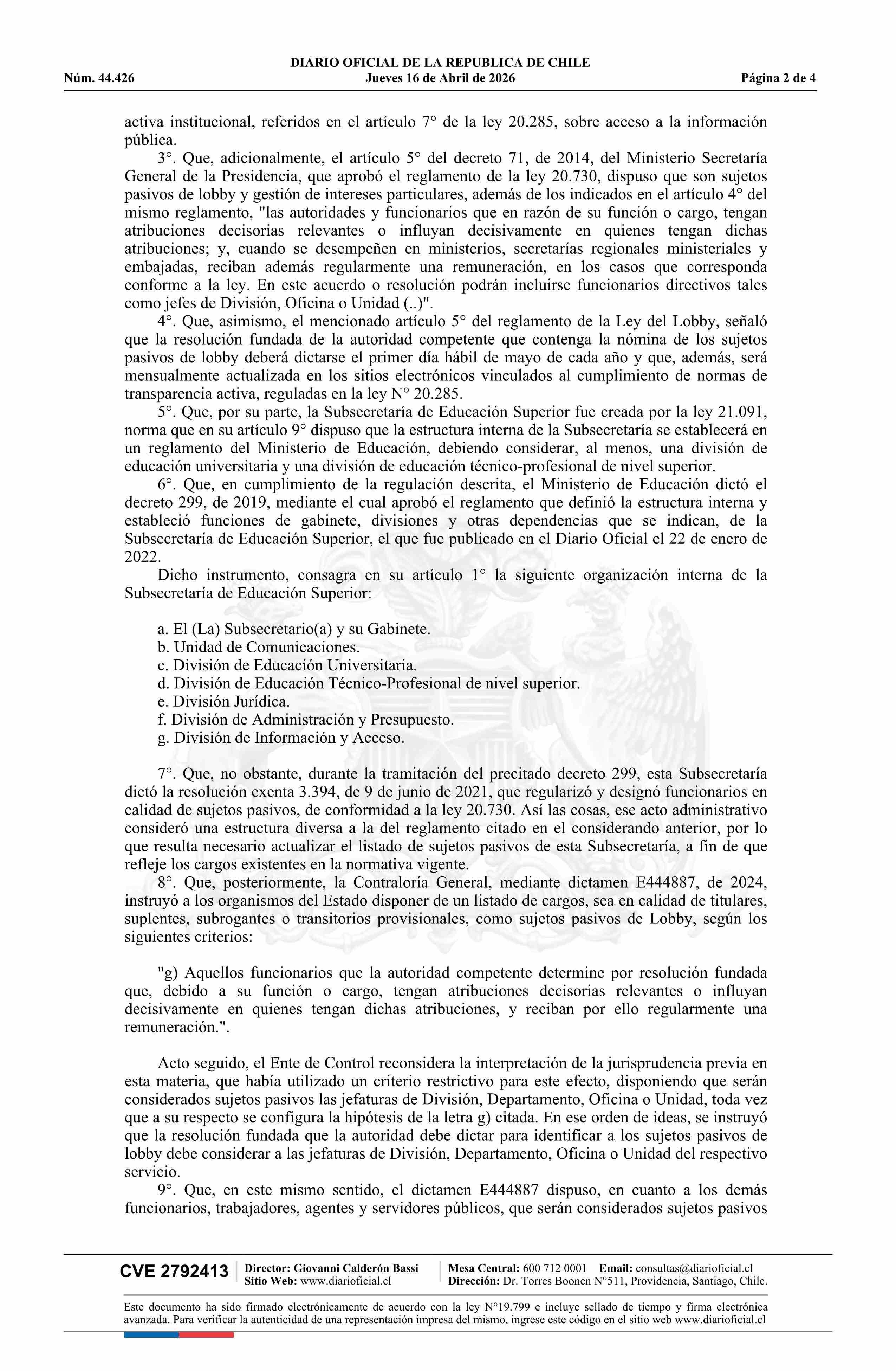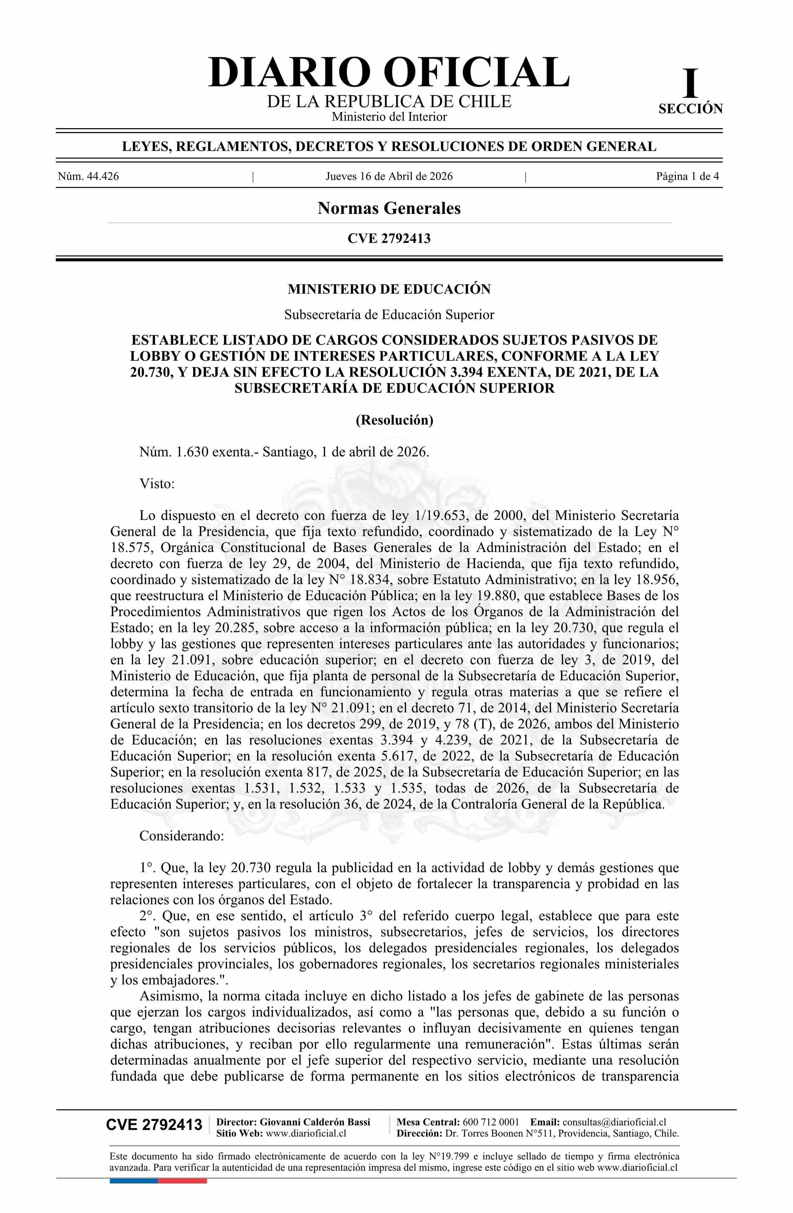 Título: Resolución exenta número 1.630, de 2026.- Establece listado de cargos considerados sujetos pasivos de lobby o gestión de intereses particulares, conforme a la ley N° 20.730, y deja sin efecto resolución N° 3.394 exenta, de 2021