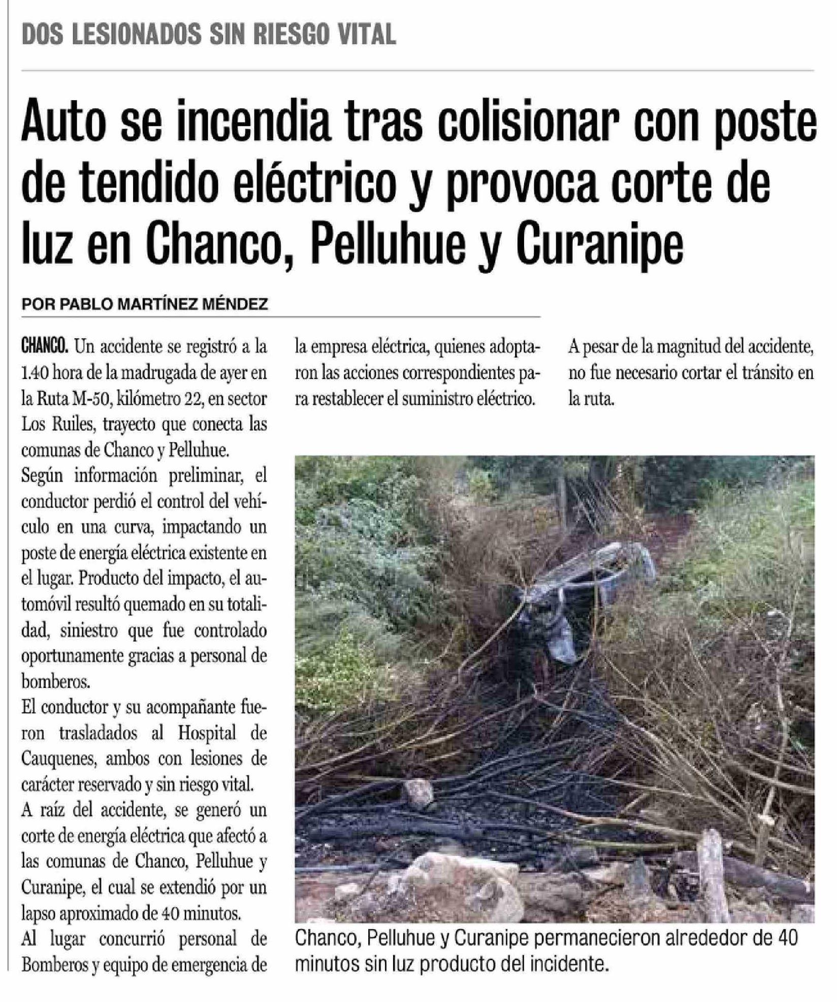 Auto se incendia tras colisionar con poste de tendido eléctrico y provoca corte de luz en Chanco, Pelluhue y Curanipe