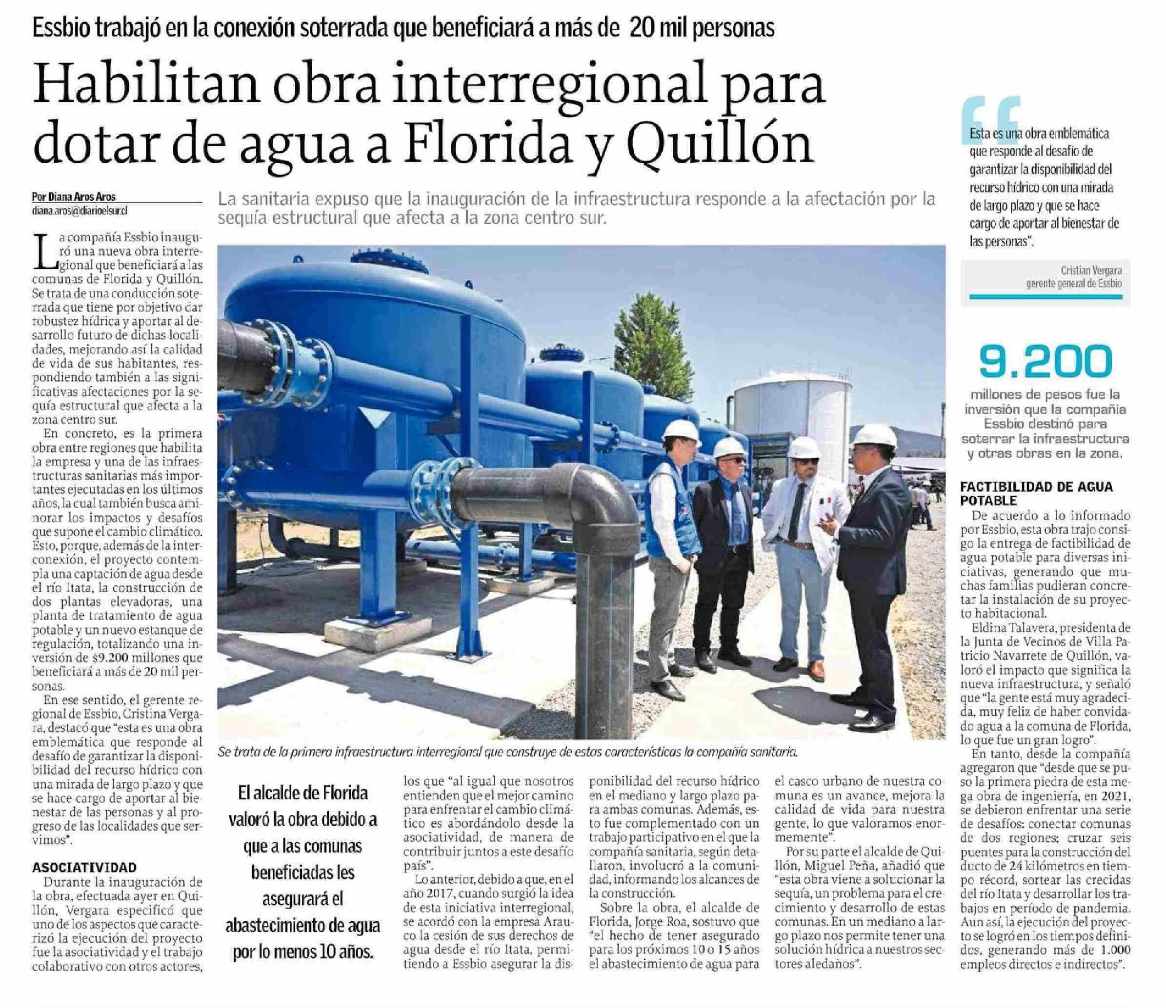 Habilitan obra interregional para dotar de agua a Florida y Quillón