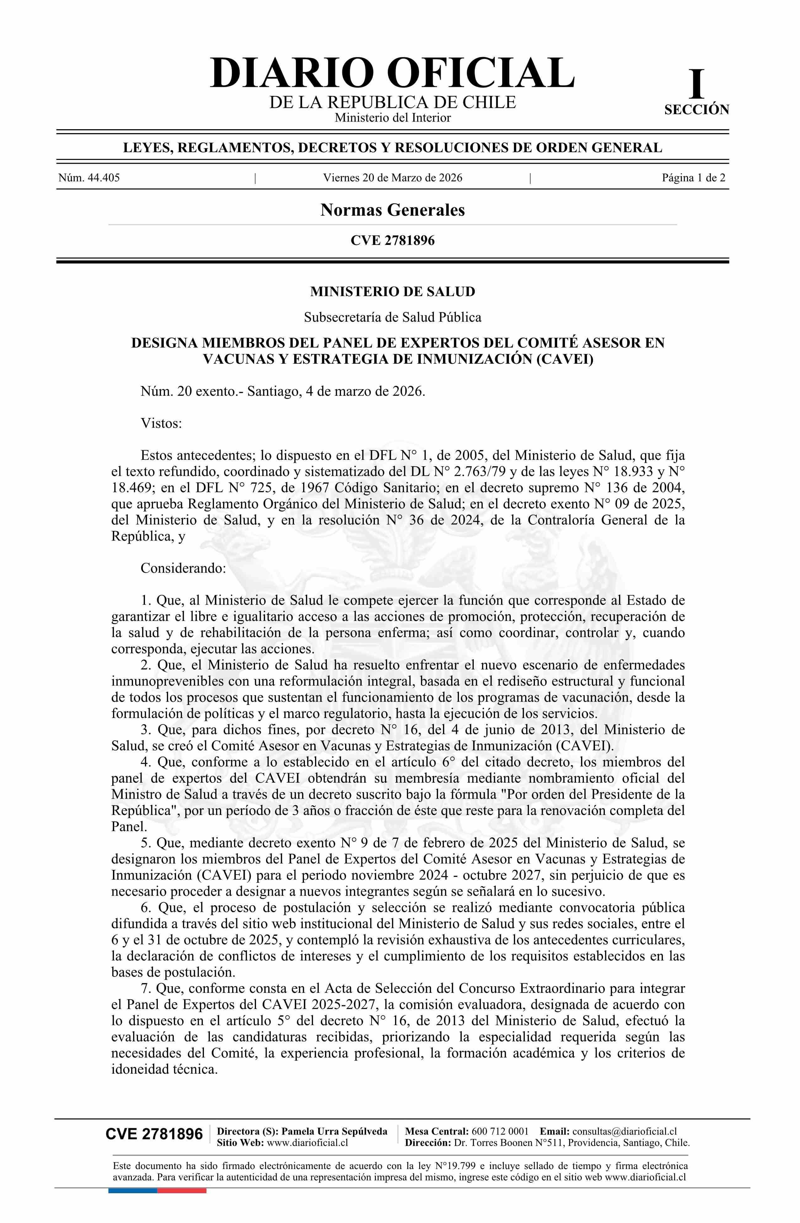 | Título: | Decreto exento número 20, de 2026.- Designa Miembros del Panel de Expertos del Comité Asesor en Vacunas y Estrategia de Inmunización |