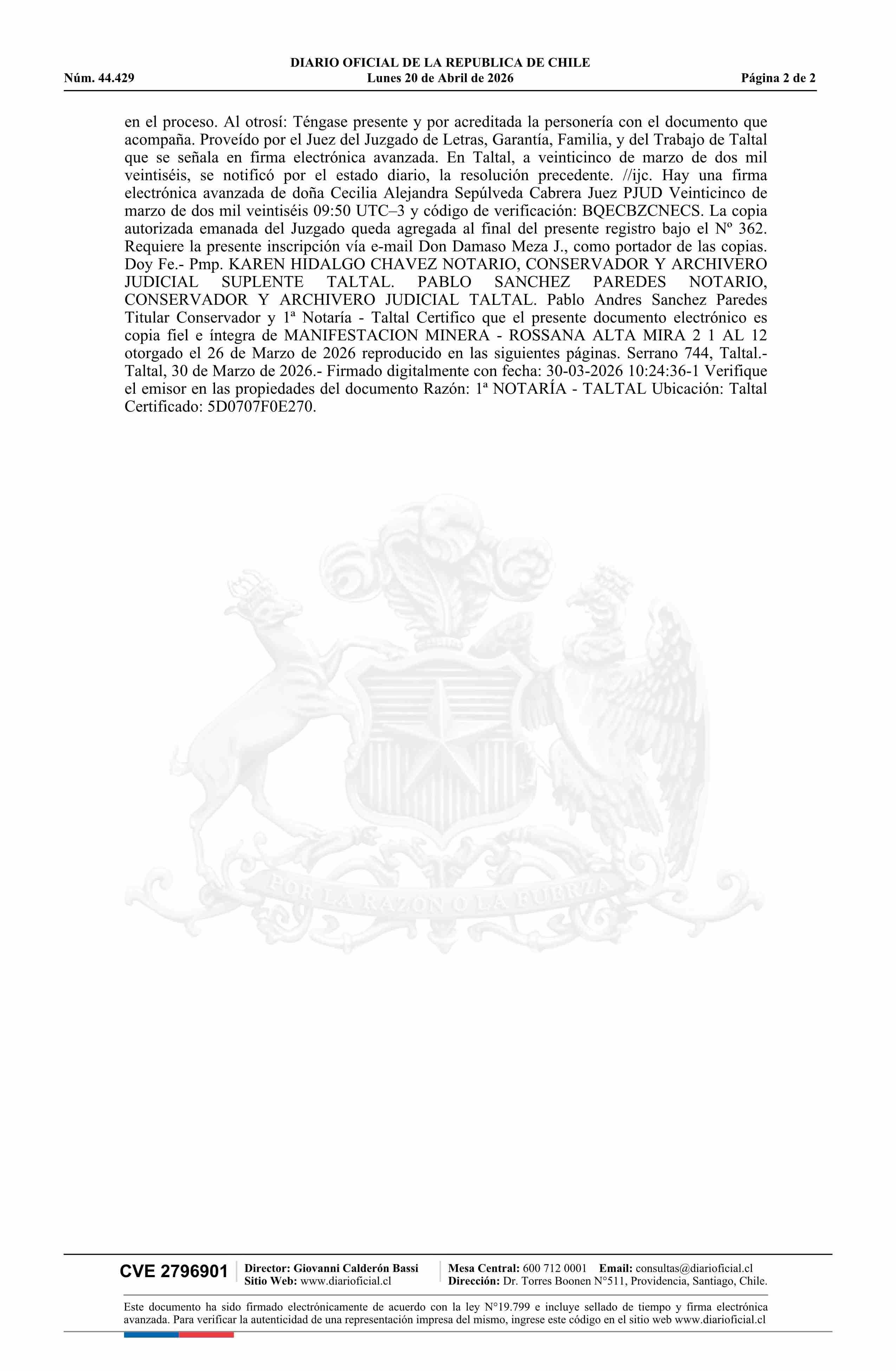 | Fuente: | DIARIO OFICIAL CHILE - BOLETÍN OFICIAL DE MINERÍA (DIARIO OFICIAL CHILE – BOM – MANIFESTACIONES MIN) | Página(s): | 19-20 |